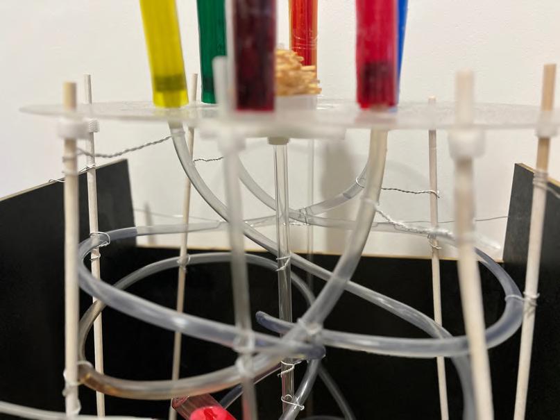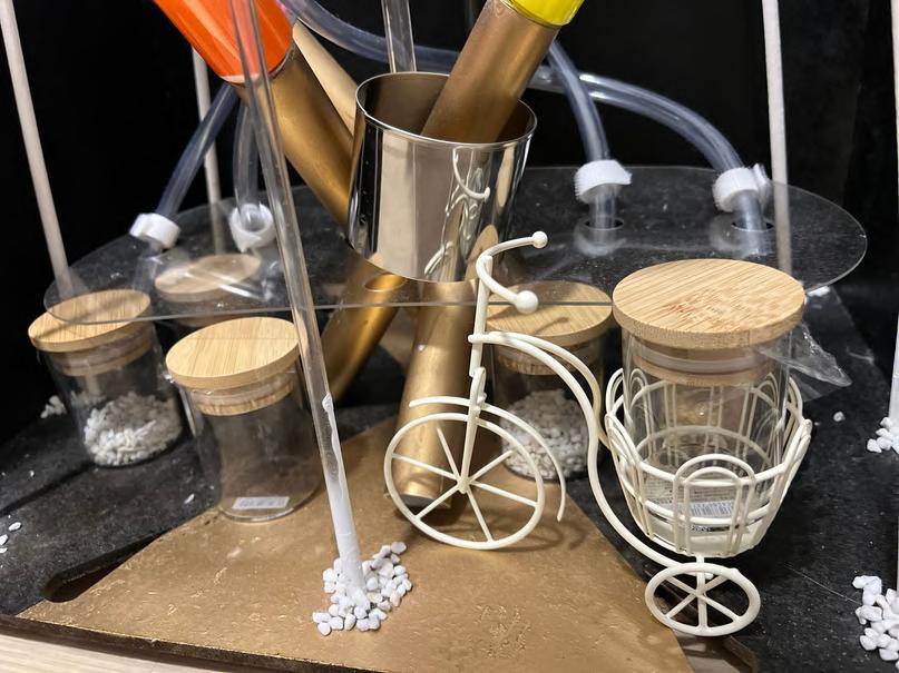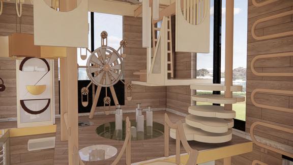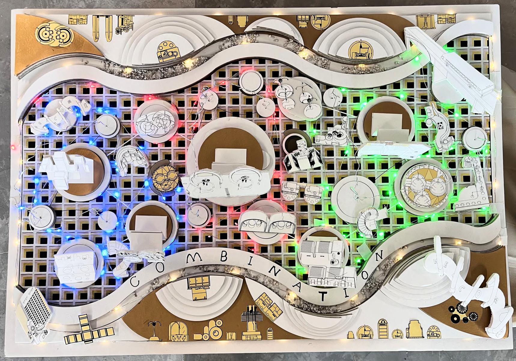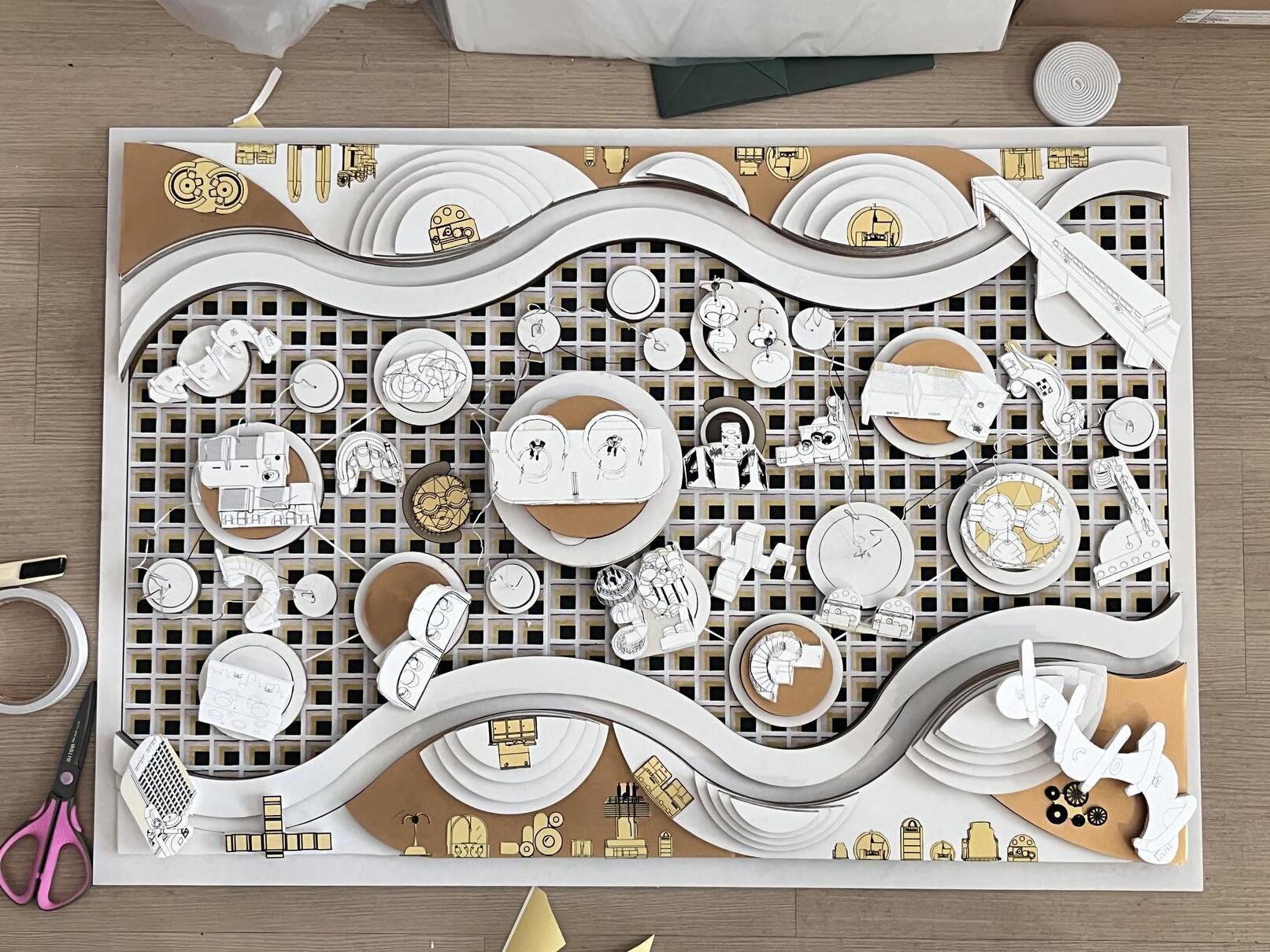 Use lazer cut to cut out large pieces of the model and then piece them together layer by layer to form a wave shape, then manually cut out each of the different pieces of furniture and furnishings, collage them onto the board, and utilize the cardboard to make the shape of a spring to highlight the design and highlights of the furniture.