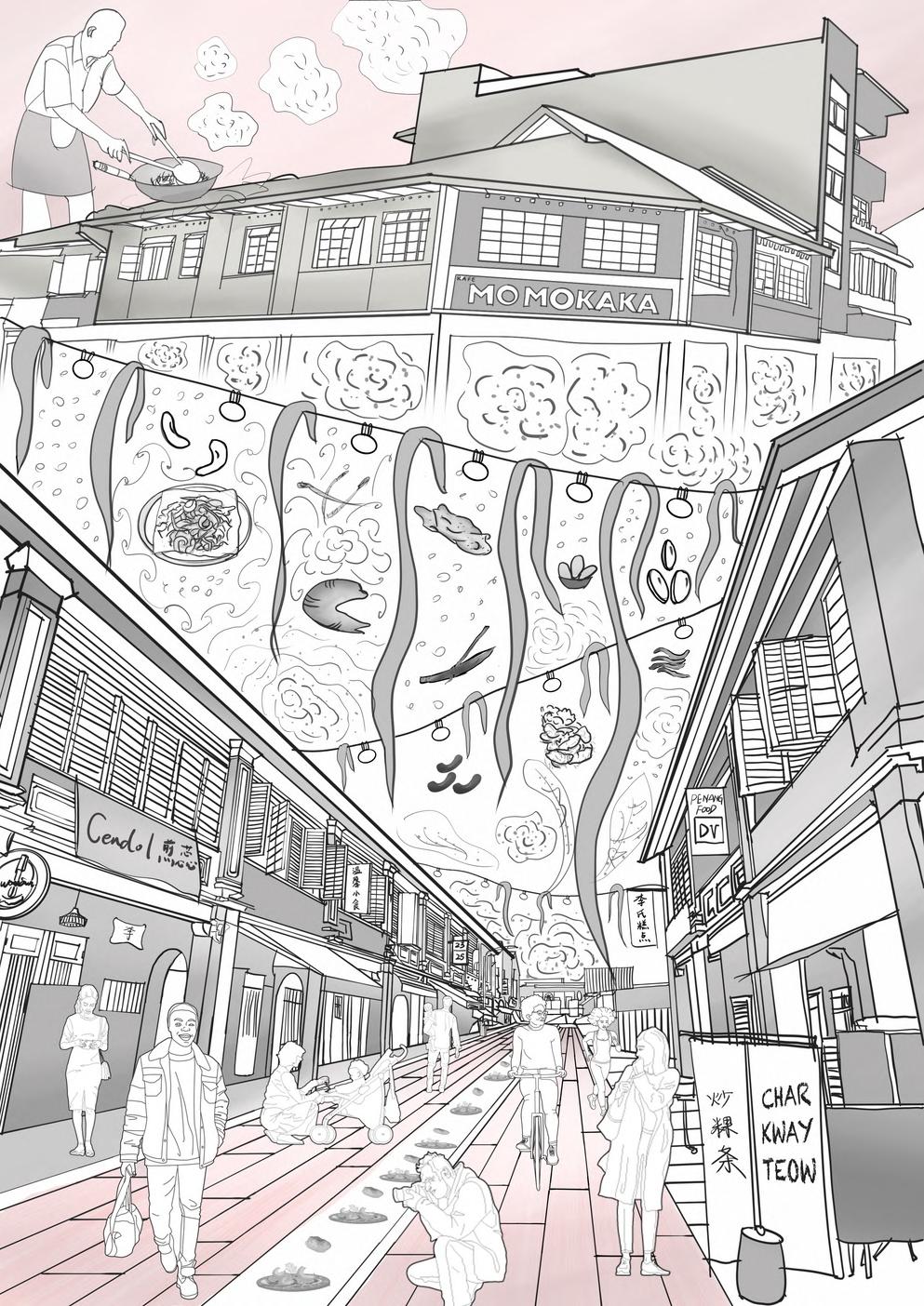 Initially inspired by the unique and delicious food of Penang, combined with the local traditional architectural structures and patterns on the walls and floors, it reminded me that as time progresses, design aesthetics and judgments are taken more seriously, so I thought of combining both traditional and modern elements to change the status quo, and to keep moving towards a modernization trend.