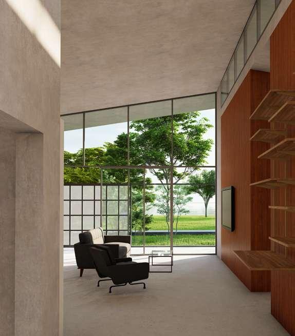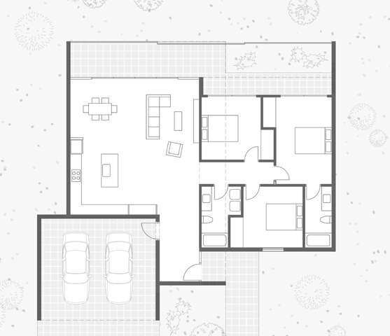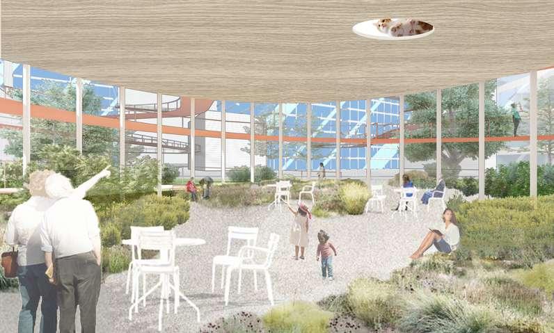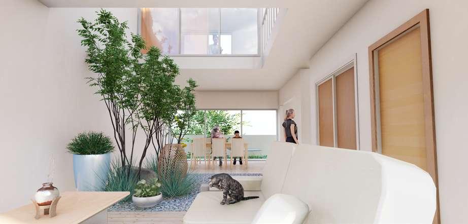 Semi-outdoor entertainment space, communal kitchen, lounge area and community garden