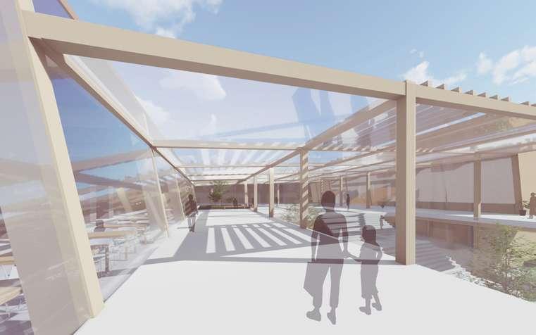 Made from translucent solar panels, the barrier offers protection while harnessing solar energy to power devices and pods within the building.