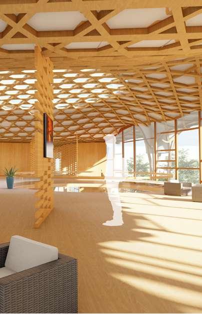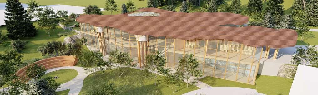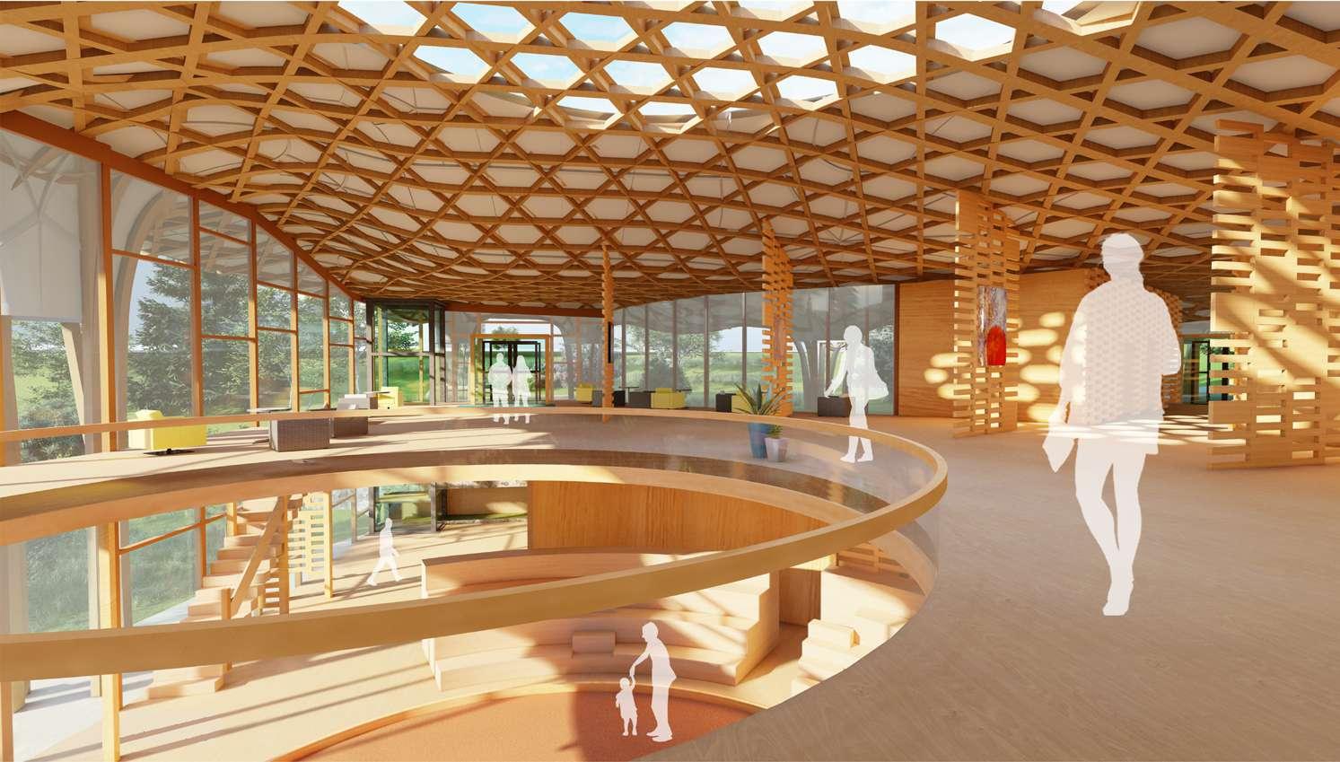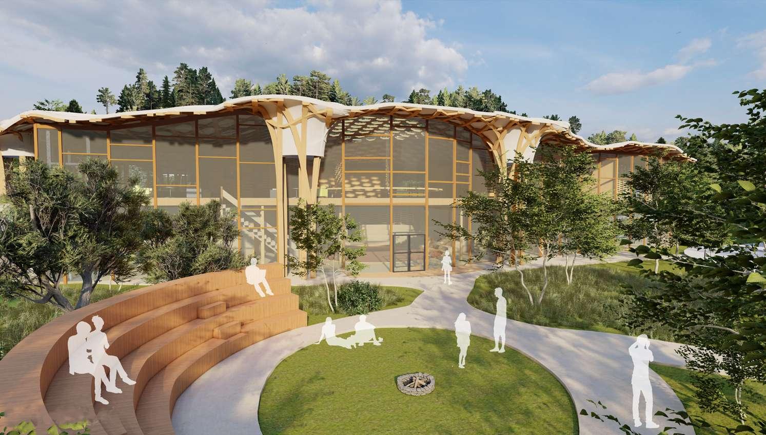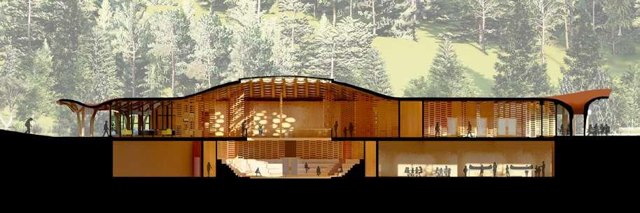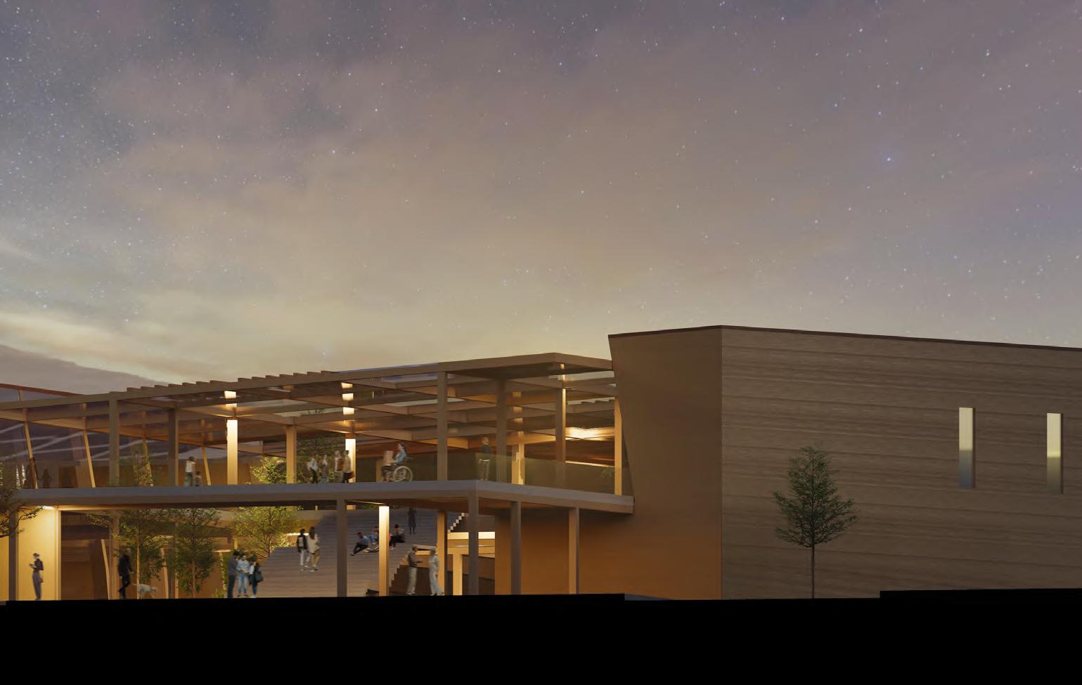 In the design, the connection to the land, axial alignment with the cardinal directions, and the central celebration and gathering space all derive from traditional native architecture. The woven structural grid was inspired by the traditional woven materials within native culture, concurrently, the woven columns serve as rainwater collectors.