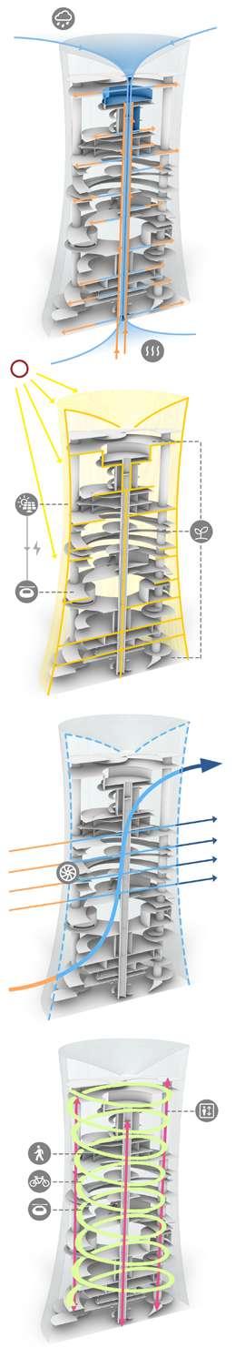 The rotating walkways connect different zones of the vertical city, facilitating movement for residents and pods. Additionally, four vertical elevators enable rapid transportation to different heights for both residents and goods.