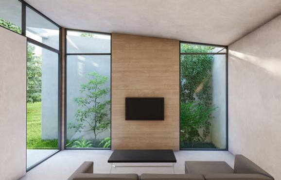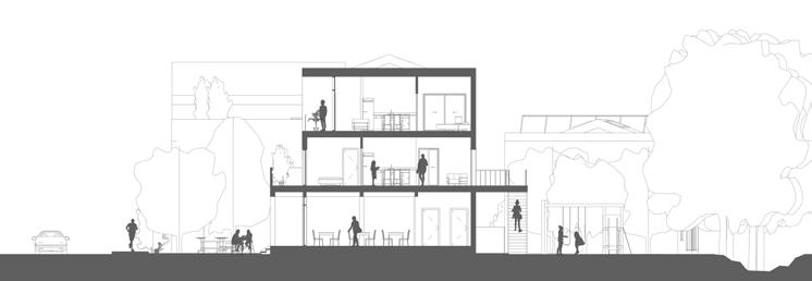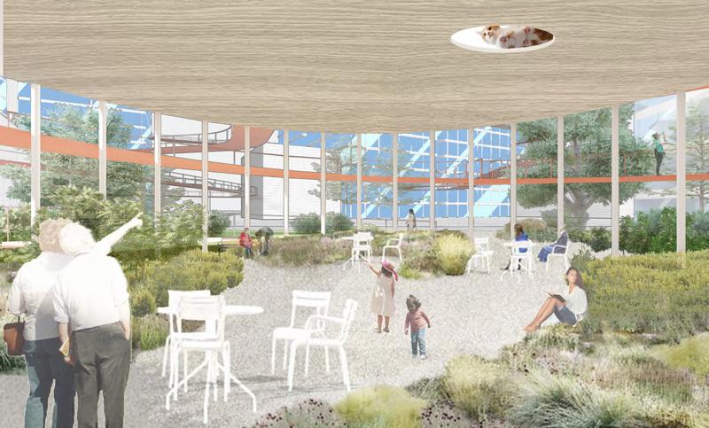 Semi-outdoor entertainment space, communal kitchen, lounge area and community garden