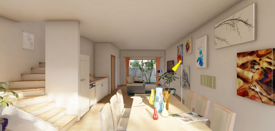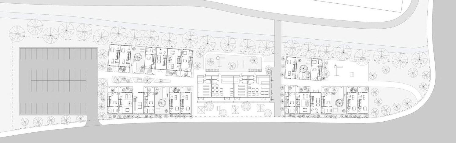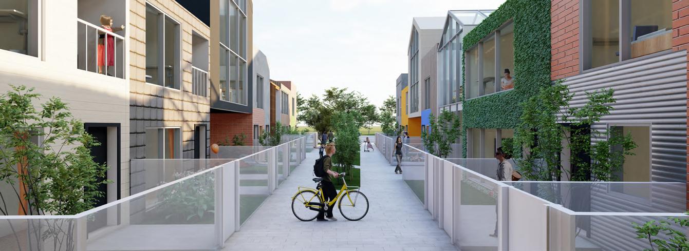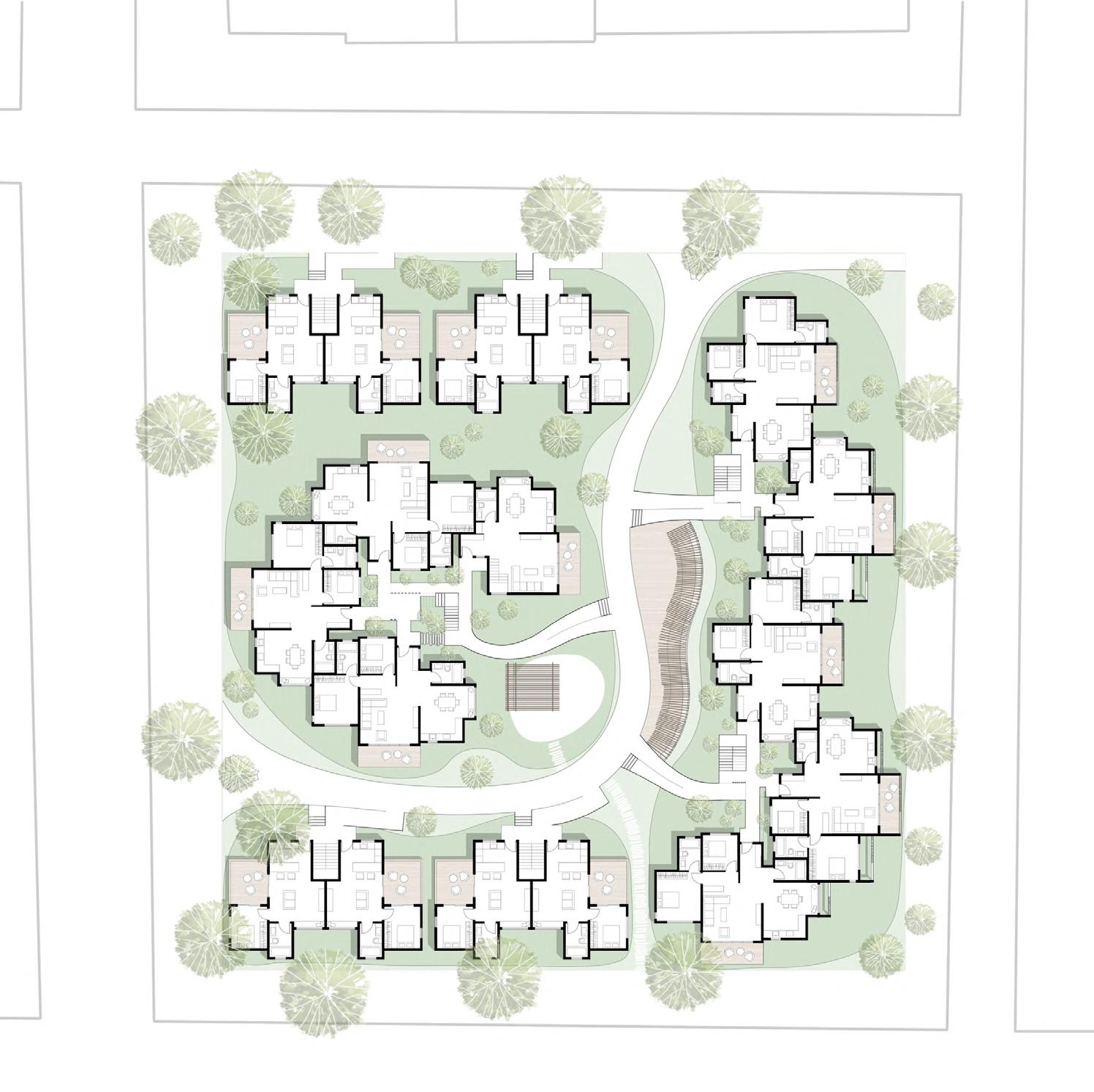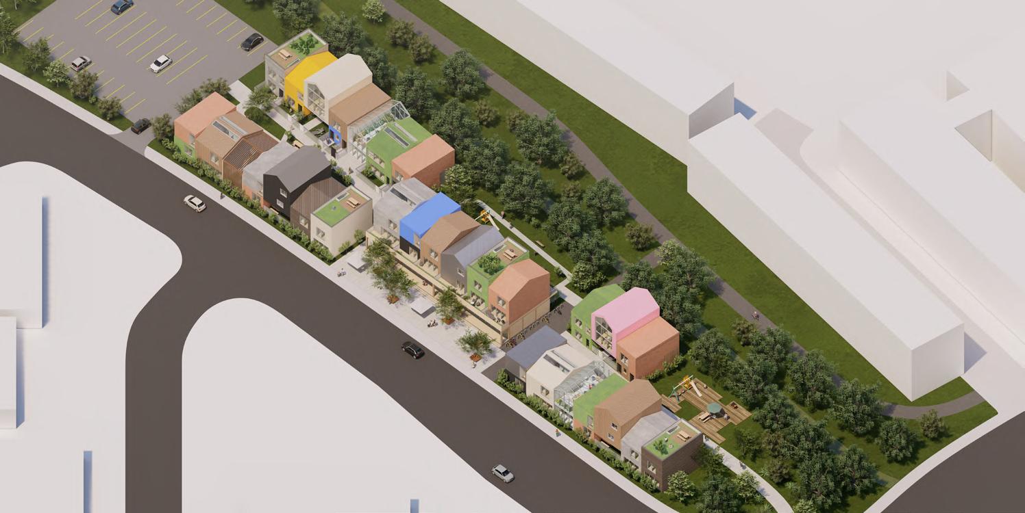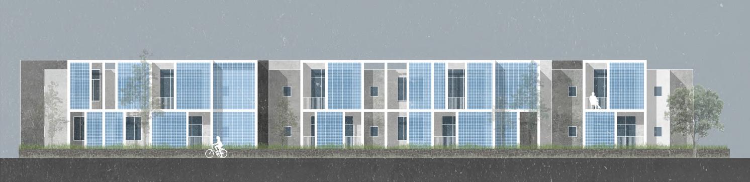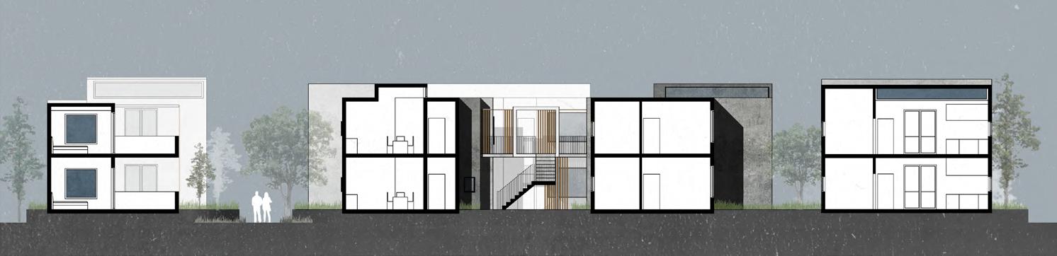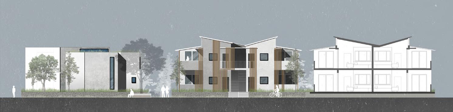 My design goal is to transform traditional social housing into a more diverse, sustainable, and interesting community by combining affordability, individuality, and diversity. Situated in Moscow near the U of I campus and the main street, this project comprises five terraces arranged in three rows, providing 35 new homes and a commercial space.