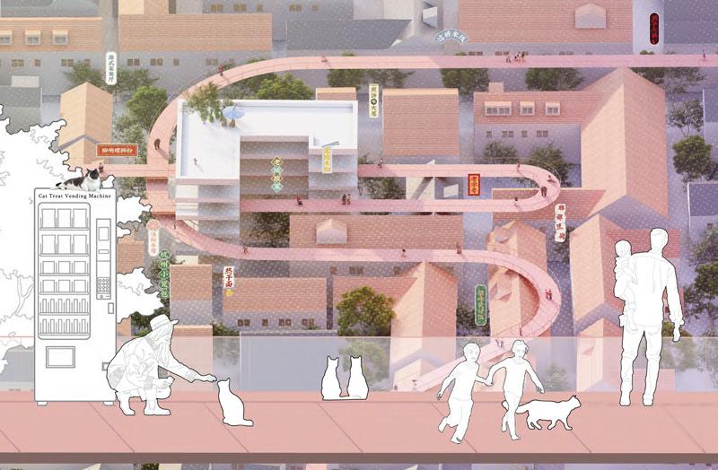 Using cats as an example, this project proposes a post-animal plan located in Shanghai, inviting cats to help enrich our spaces and our own perception, transforming past objectification and exploitation of animals into positive factors, and establishing symbiotic habitats. By gradually changing people's attitudes, behaviors, and world views, it encourages us to reconsider our relationship with cats and address the injustices cats face.