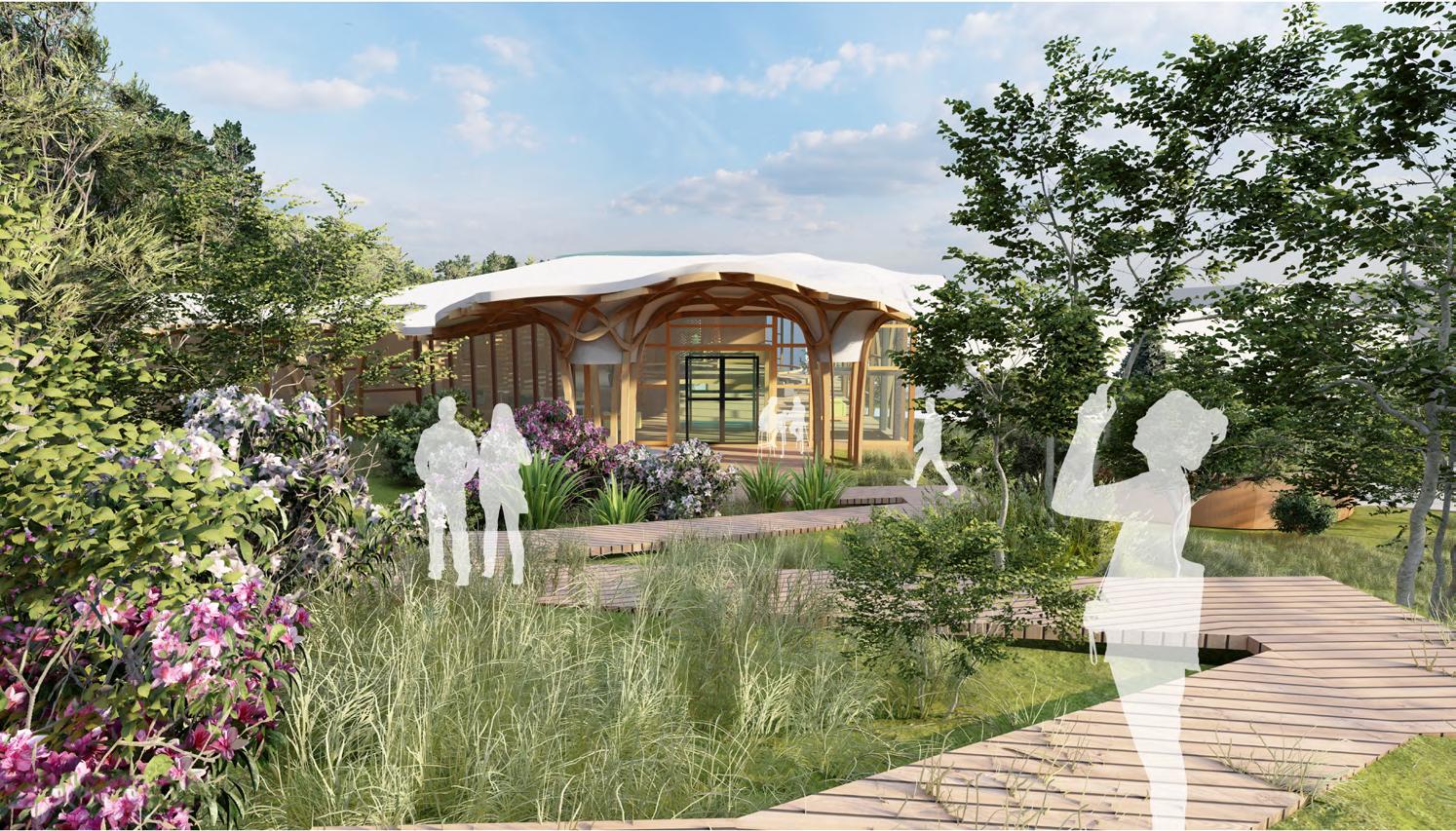 Made from translucent solar panels, the barrier offers protection while harnessing solar energy to power devices and pods within the building.
