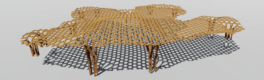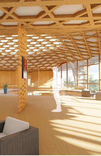 In the design, the connection to the land, axial alignment with the cardinal directions, and the central celebration and gathering space all derive from traditional native architecture. The woven structural grid was inspired by the traditional woven materials within native culture, concurrently, the woven columns serve as rainwater collectors.