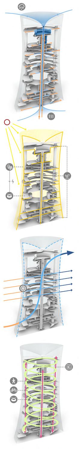 The rotating walkways connect different zones of the vertical city, facilitating movement for residents and pods. Additionally, four vertical elevators enable rapid transportation to different heights for both residents and goods.
