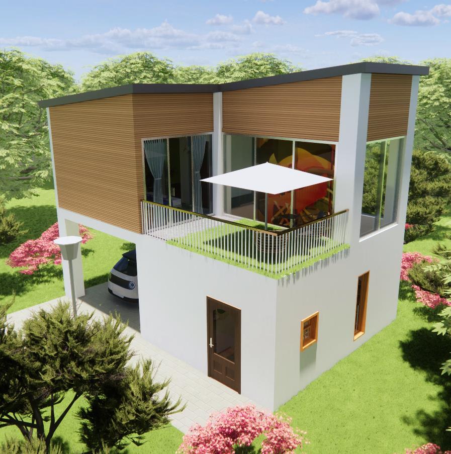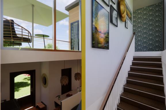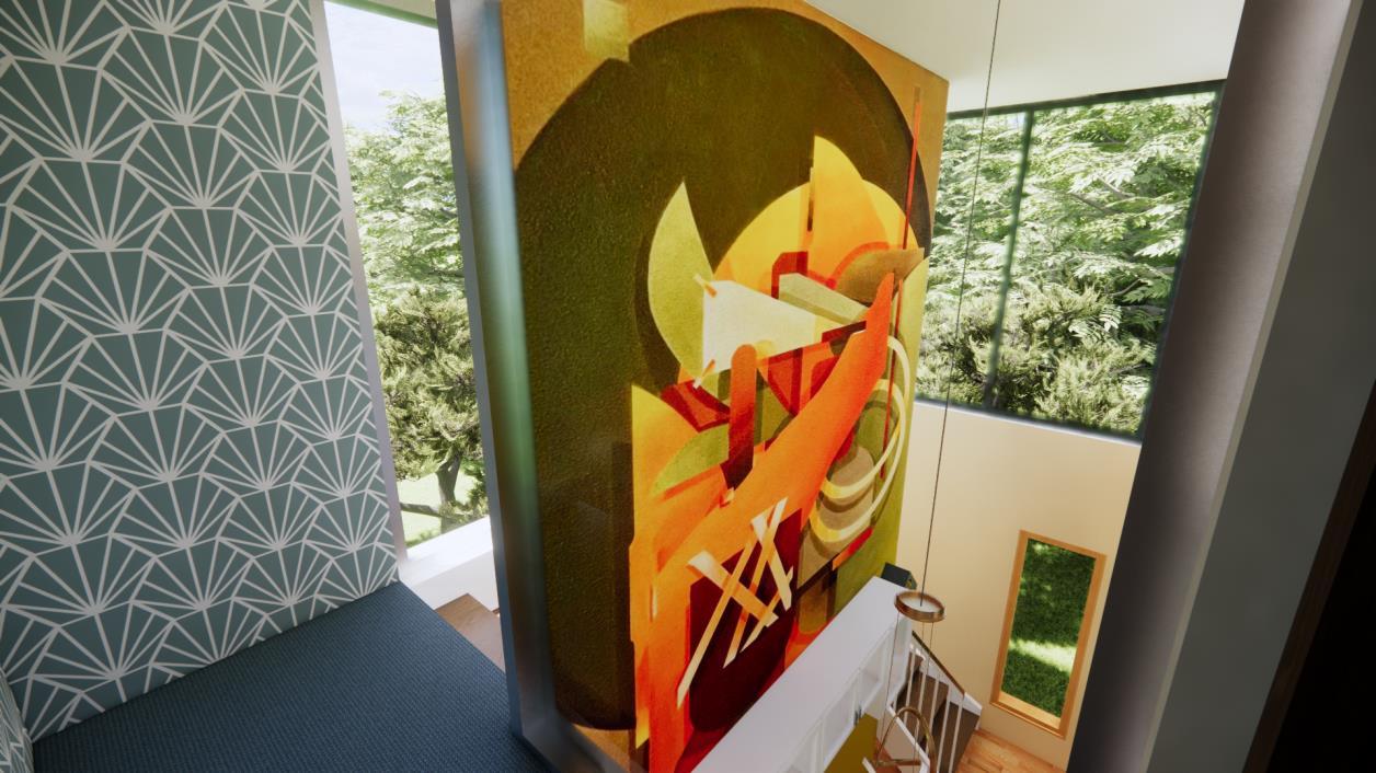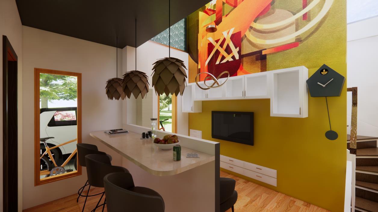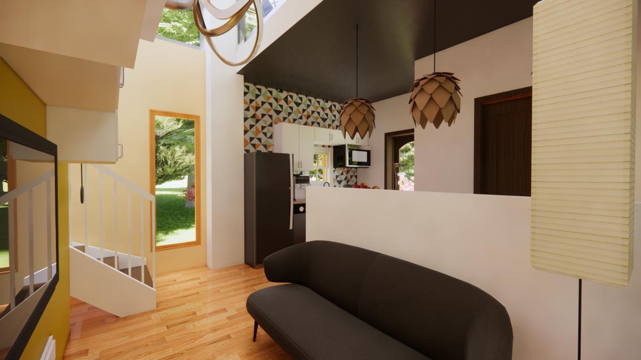 About how many rooms can fit in a 500-square-foot interior space? A two-car garage? Two master bedrooms? A studio apartment? How about a full-size luxury house with one and a half bathrooms and a master bedroom? Within 500 square feet of interior space, a two-story house with parking space and a terrace is the tiny house I present. The “Sherwood” is named after my inspiration, the oil painting “Sherwood” by the graffiti master, Zhanliang Chen. The tiny house with a 20-foot-high wall decorated in graffiti as the axis is representative of aesthetics, functionality, and minimalism.