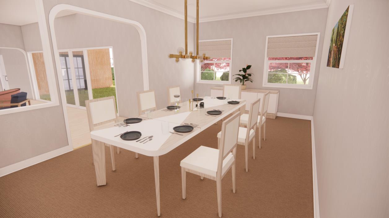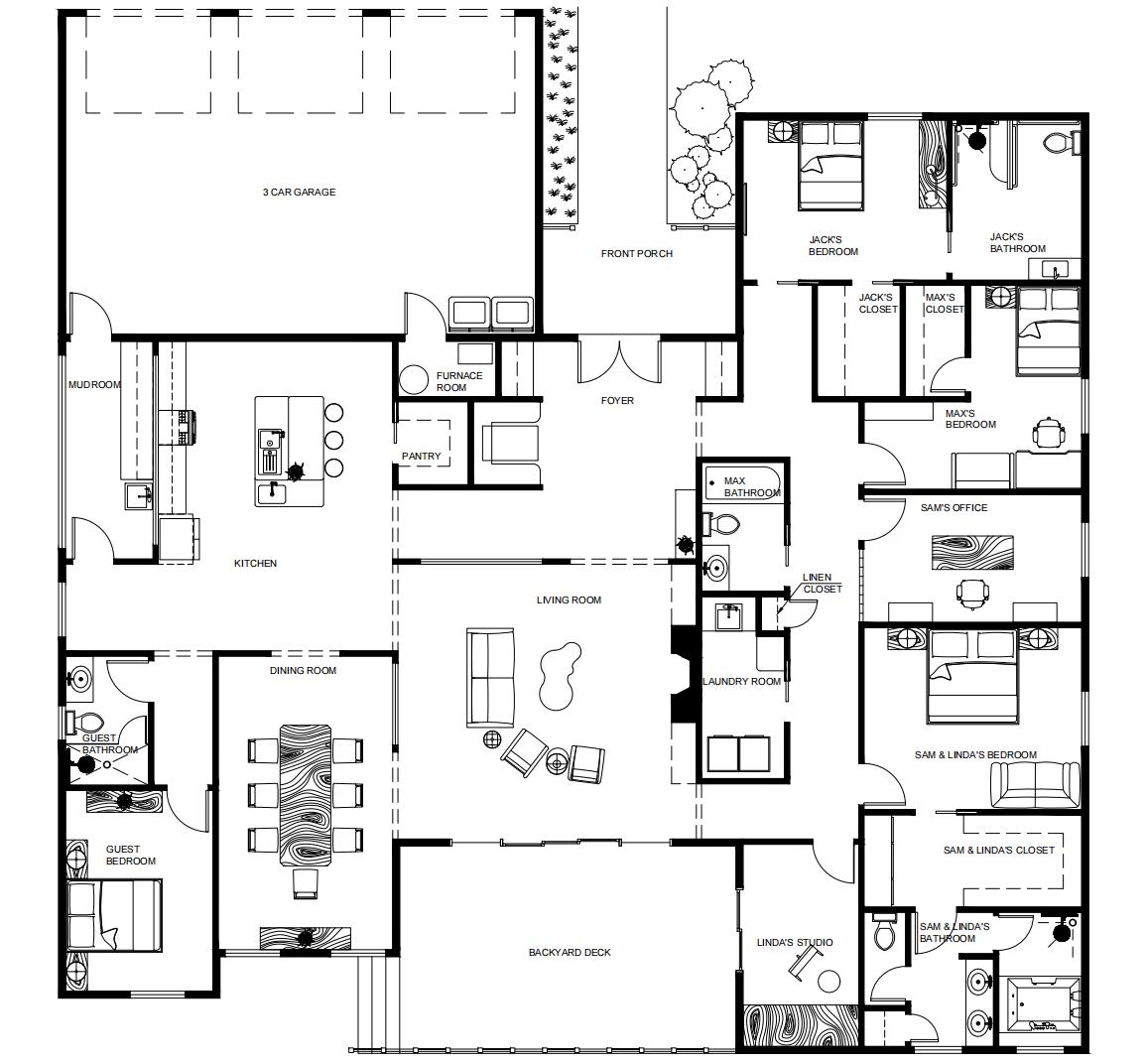 The project goal is to build a dream home for Sam and Linda Green that accommodates their family and guests, including Linda‘s father, Jack, who uses a wheelchair. The house should feel cozy and intimate for everyday living but also be spacious enough to host large parties and family gatherings. The design should avoid using yellow to accommodate Sam's preference while creating a happy and bright atmosphere to satisfy Linda's desires.