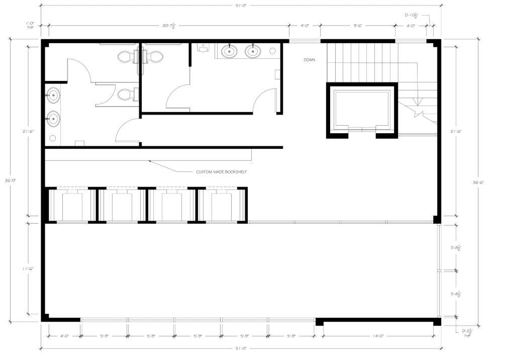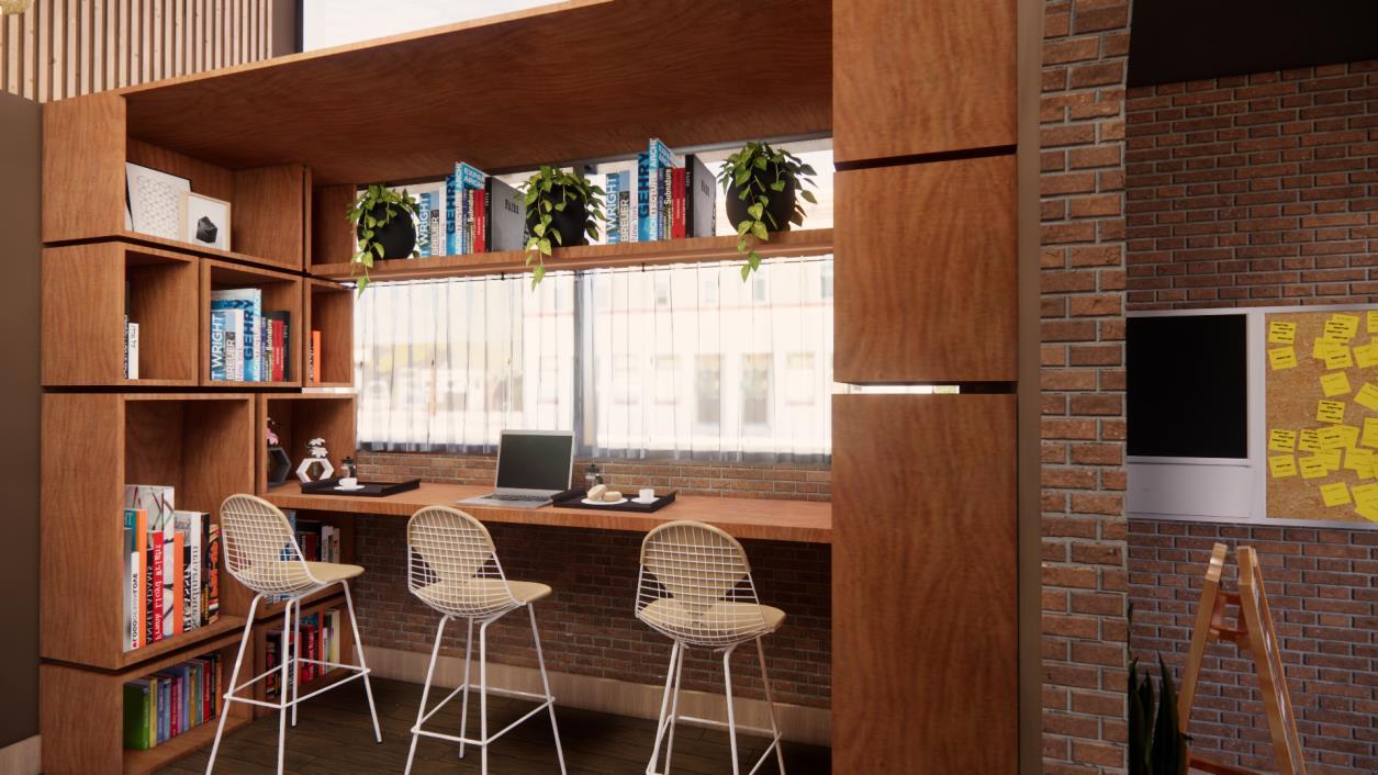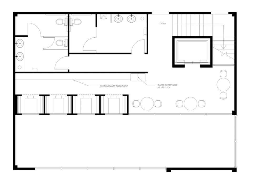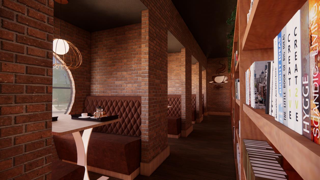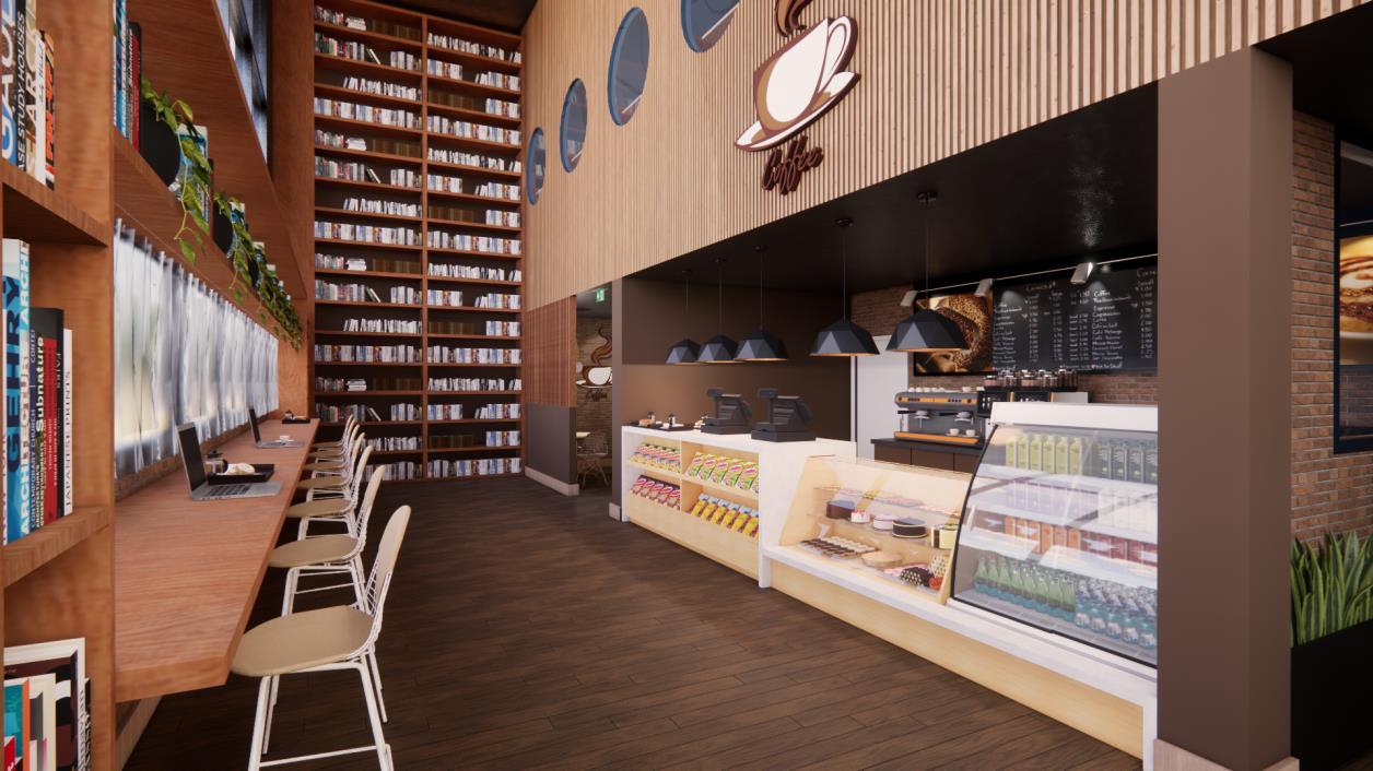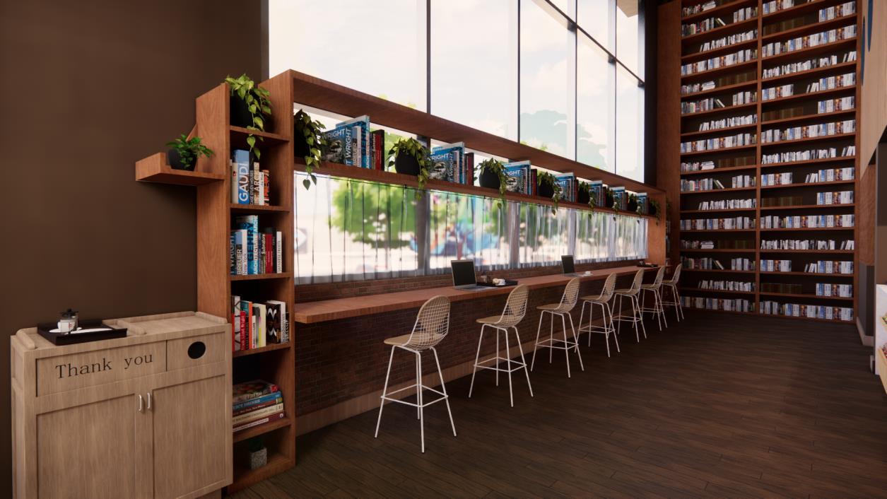 Driven by my passion for a duplex building structure, I transformed the single-story coffee shop into a duplex without altering the original exterior wall dimensions. The interior space design prioritizes meetingADA standards while enhancing natural light and mitigating excessive sunlight through carefully curated window treatments. The coffee shop's theme centers around book reading, with distinct designated areas serving different purposes to elevate the customer experience and increase leisure and work efficiency. My ultimate goal is to create an elegant, comfortable, and book-filled coffee shop that appeals to a broader customer base and enhances overall customer satisfaction.