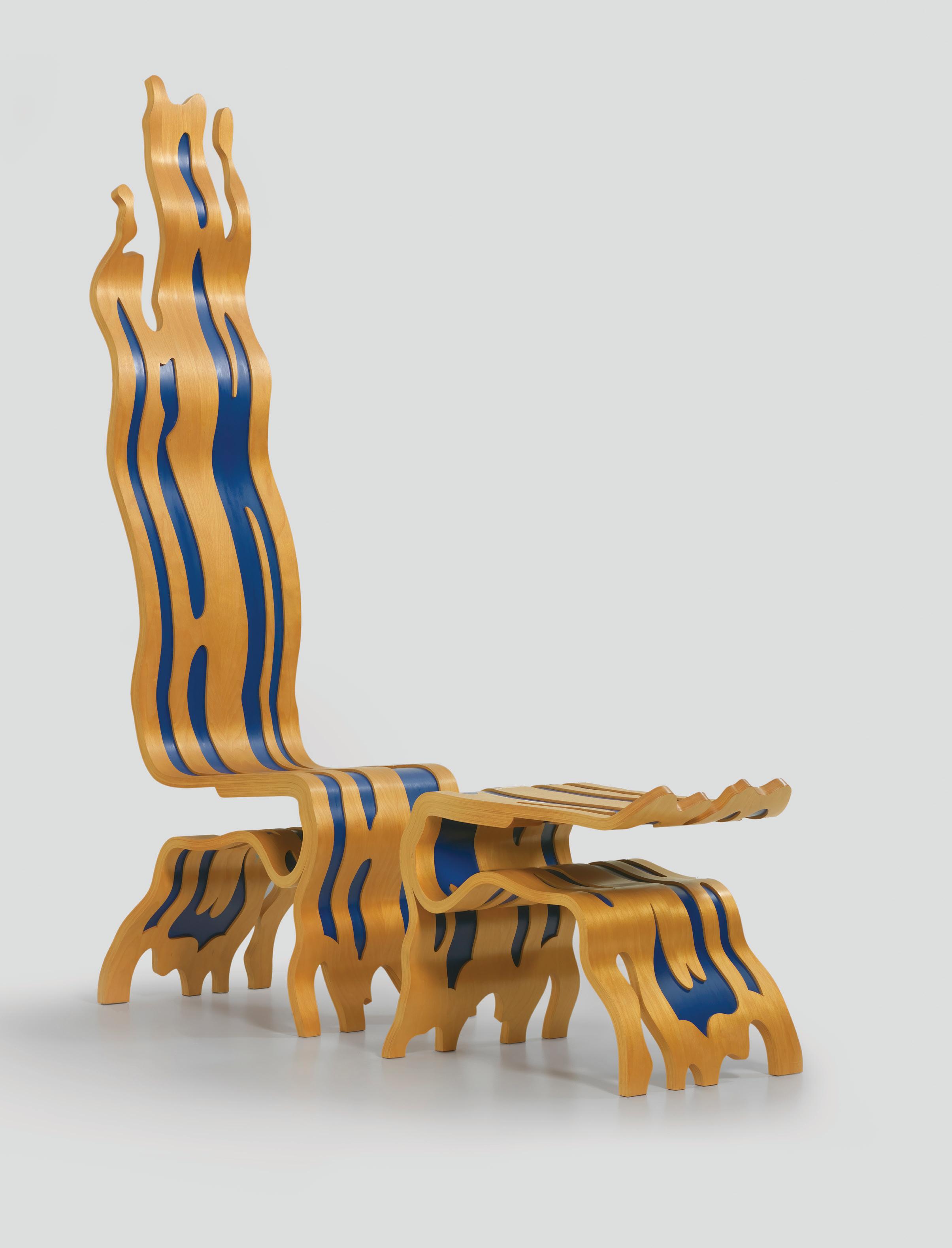 RIGHT: Roy Fox Lichtenstein (1923–97), Graphicstudio, University of South Florida (United States, 1968–), Beeken Parsons (United States, 1983–). Brushstroke Chair and Ottoman (detail), 1986–88, laminated white birch veneer, paint, clear varnish. Collection of the Thomas H. and Diane DeMell Jacobsen Ph.D. Foundation. L2023.63.4a-b © Estate of Roy Lichtenstein