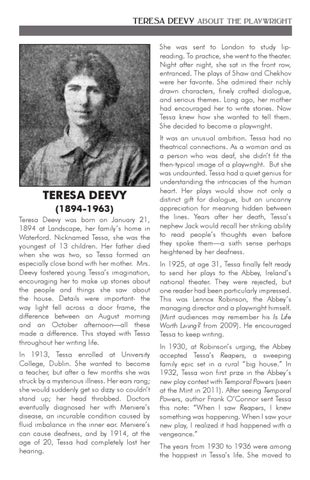 TERESA DEEVY (1894-1963) Teresa Deevy was born on January 21, 1894 at Landscape, her family’s home in Waterford. Nicknamed Tessa, she was the youngest of 13 children. Her father died when she was two, so Tessa formed an especially close bond with her mother. Mrs. Deevy fostered young Tessa’s imagination, encouraging her to make up stories about the people and things she saw about the house. Details were important- the way light fell across a door frame, the difference between an August morning and an October afternoon—all these made a difference. This stayed with Tessa throughout her writing life. In 1913, Tessa enrolled at University College, Dublin. She wanted to become a teacher, but after a few months she was struck by a mysterious illness. Her ears rang; she would suddenly get so dizzy so couldn’t stand up; her head throbbed. Doctors eventually diagnosed her with Meniere’s disease, an incurable condition caused by fluid imbalance in the inner ear. Meniere’s can cause deafness, and by 1914, at the age of 20, Tessa had completely lost her hearing.
