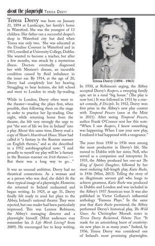 Teresa Deevy (1894 - 1963) In 1930, at Robinson’s urging, the Abbey accepted Deevy’s Reapers, a sweeping family epic set in a rural “big house.” (The play is now lost.) It was followed in 1931 by a oneact comedy, A Disciple. In 1932, Deevy won first prize in the Abbey’s new play contest with Temporal Powers (seen at the Mint in 2011). After seeing Temporal Powers, author Frank O’Connor sent her this note: “When I saw Reapers, I knew something was happening. When I saw your new play, I realized it had happened with a vengeance.” The years from 1930 to 1936 were among the most productive in Deevy’s life. She moved to Dublin with her sister, Nell, who served as a companion and interpreter. In 1935, the Abbey produced her one-act The King of Spain’s Daughter, followed by her most enduring full-length play, Katie Roche, in 1936 (Mint, 2013). Telling the story of an illegitimate servant girl who longs to achieve greatness, Katie Roche was produced in Dublin and London and was included in the Abbey’s 1937 American tour. It was also published in Victor Gollancz’s influential anthology “Famous Plays.” In the same year that Katie Roche premiered, the Abbey performed Deevy’s historical play, The Wild Goose. As Christopher Morash notes in Teresa Deevy Reclaimed, Volume Two: “It made for an astonishing burst of creativity: six new plays in as many years.” Indeed, by 1936, Teresa Deevy was considered one of Ireland’s most promising playwrights.