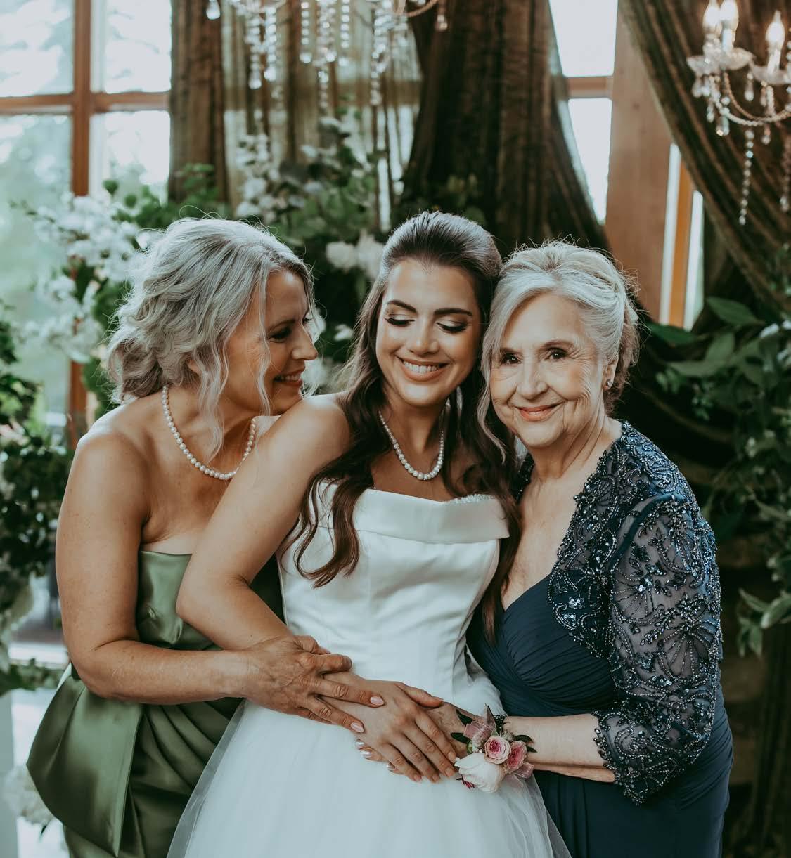 The bride’s long hair was styled in loose curls with a soft half-up finish, creating graceful movement while providing the perfect placement for her flowing veil, resulting in a look that paired beautifully with her strapless gown. For the mother of the bride, a relaxed low bun with delicate tendrils added softness and timeless charm, while the grandmother’s mid-height bun offered a polished sophistication that framed her face with gentle ease. Each style was intentionally understated yet elegant, harmonizing perfectly with the romantic, luxurious tone of the day.