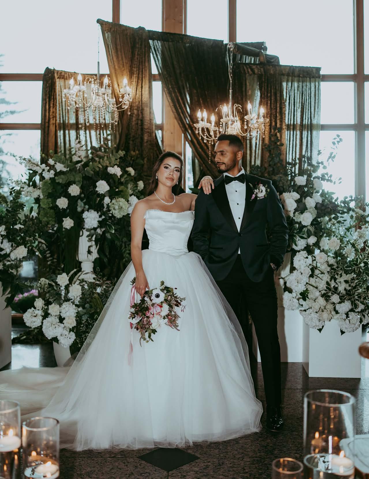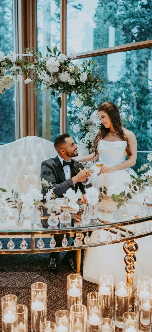 The architectural florals by Flora Arch set the tone for the celebration. Their vision was to create a luxurious and romantic secret garden that blended modern artistry with timeless elegance. Using real-touch silk florals, they built grand installations for the ceremony altar, guest tables and the sweetheart table, complemented by soft, airy arrangements across the reception tables and lounge spaces.