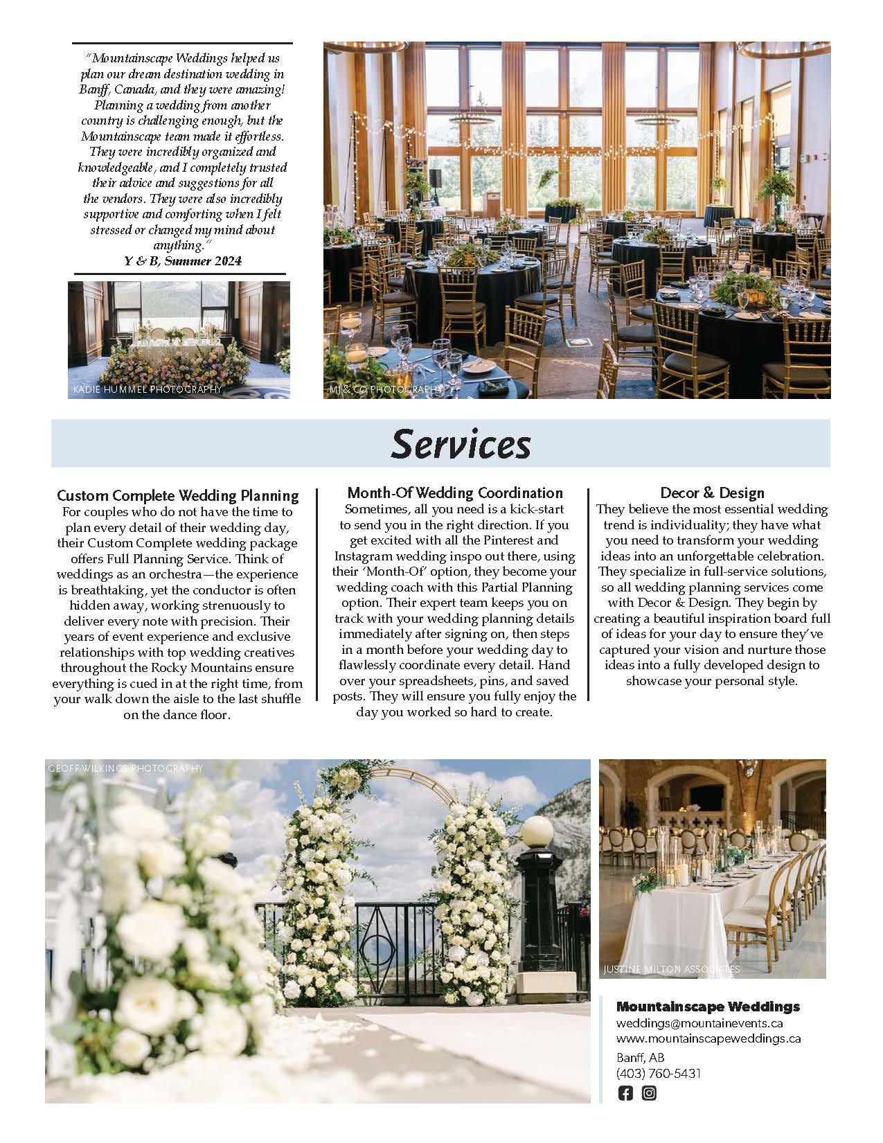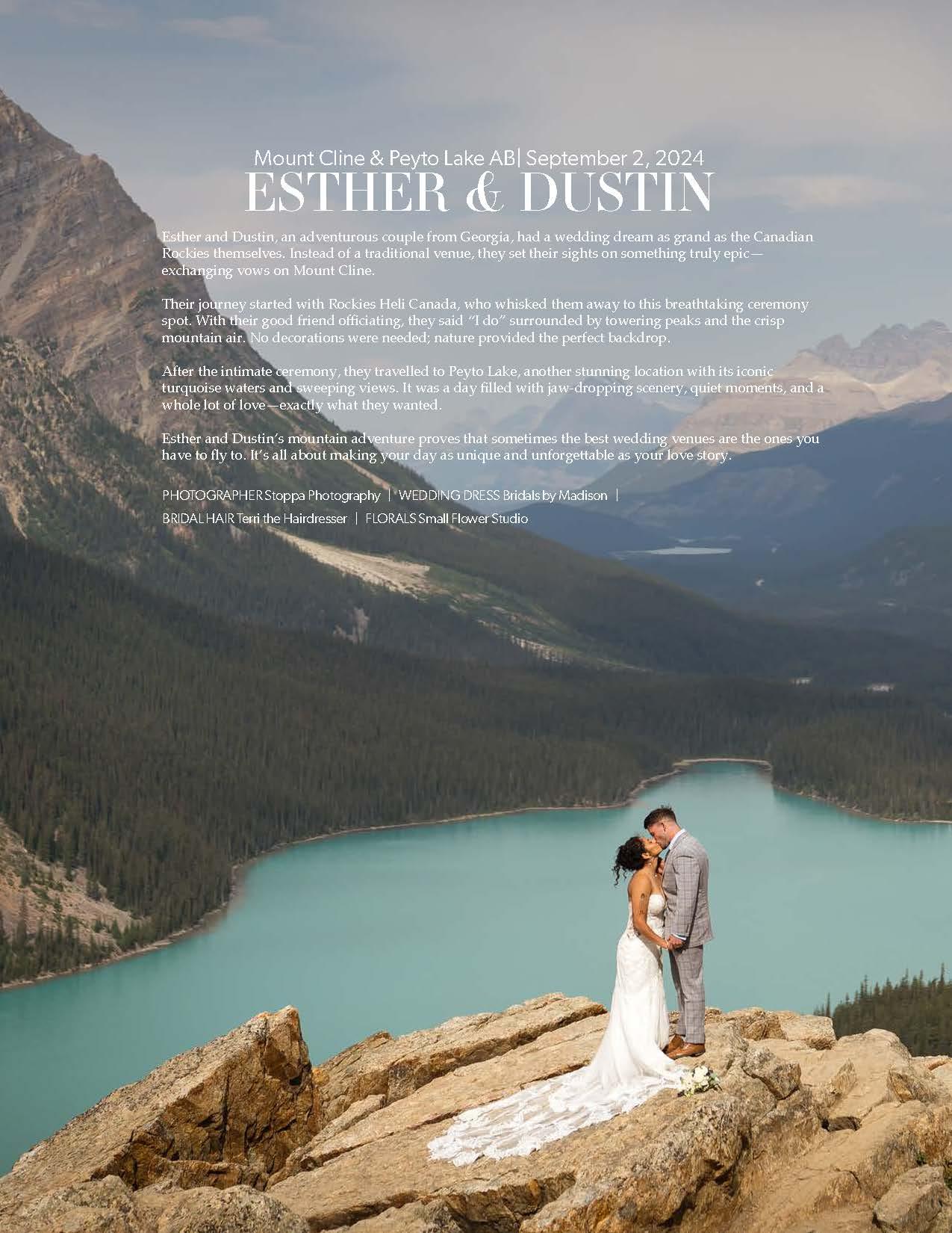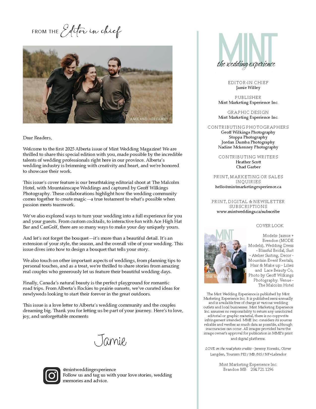 Explore Alberta weddings photographed in epic mountain settings with a cover photo and editorial from The Malcolm in Canmore. Featuring intimate elopements, styled shoots, and vendor spotlights across Banff, Canmore and Jasper, this issue highlights local wedding vendors, planning tips, and creative inspiration for couples seeking a mountain celebration. Ideal for brides, grooms, photographers and planners looking for Rocky Mountain wedding ideas and vendor connections.