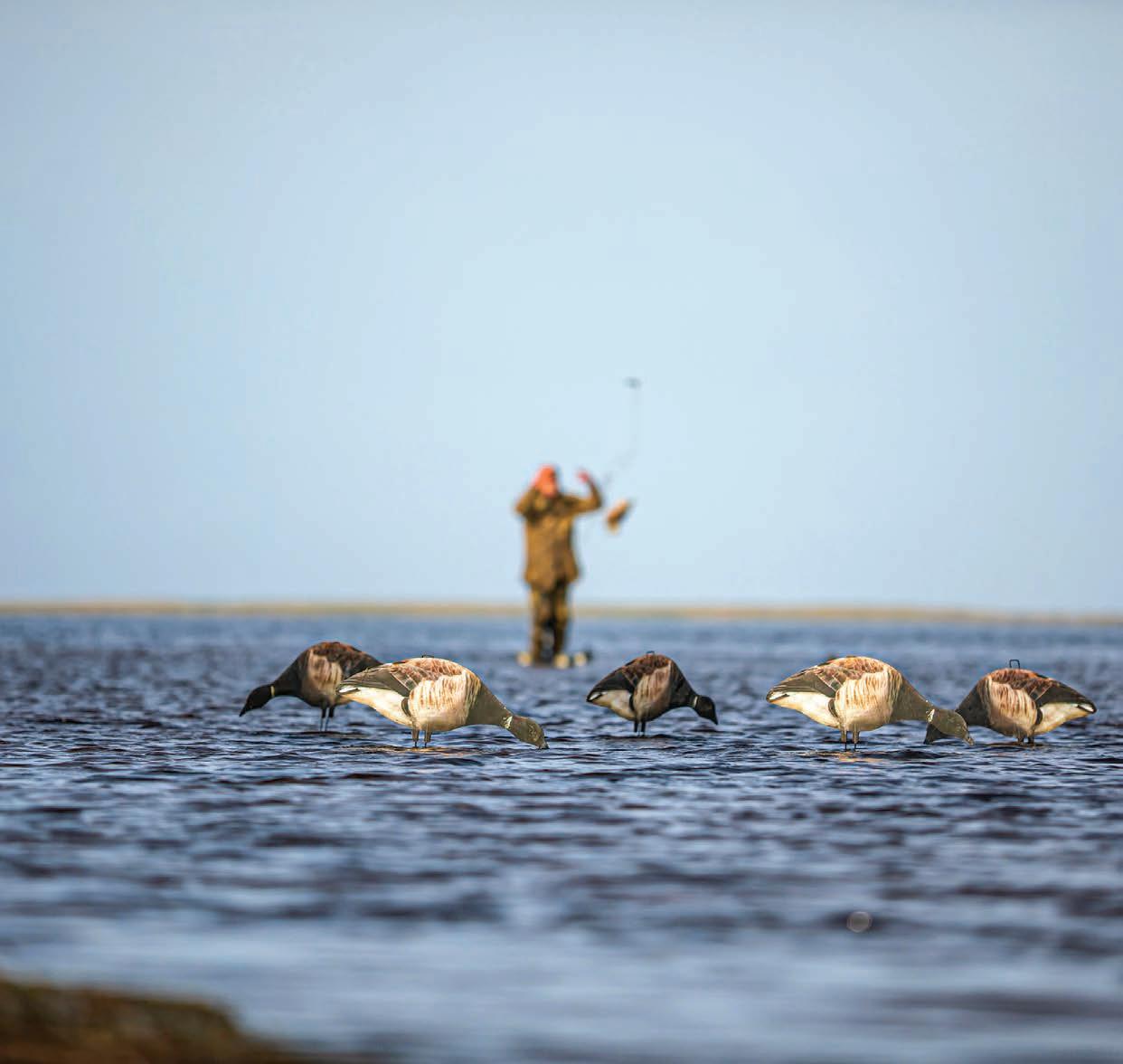 For geese – be it brant, cacklers or other subspecies of Canada geese – I like going with six to 12 floating decoys and a few-dozen silhouette decoys set along a shoreline. Silhouette decoys are great because they’re easy to pack, are affordable and it’s simple to put out a lot of them to create the feel of a big flock.