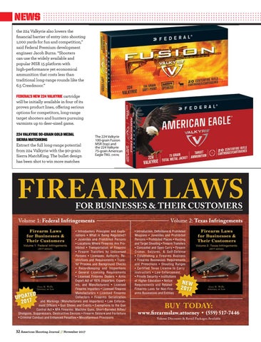 NEWS the 224 Valkyrie also lowers the financial barrier of entry into shooting 1,000 yards for fun and competition,” said Federal Premium development engineer Jacob Burns. “Shooters can use the widely available and popular MSR 15 platform with high-performance yet economical ammunition that costs less than traditional long-range rounds like the 6.5 Creedmoor.” FEDERAL’S NEW 224 VALKYRIE cartridge will be initially available in four of its proven product lines, offering serious options for competitors, long-range target shooters and hunters pursuing varmints up to deer-sized game. 224 VALKYRIE 90-GRAIN GOLD MEDAL SIERRA MATCHKING Extract the full long-range potential from 224 Valkyrie with the 90-grain Sierra MatchKing. The bullet design has been shot to win more matches