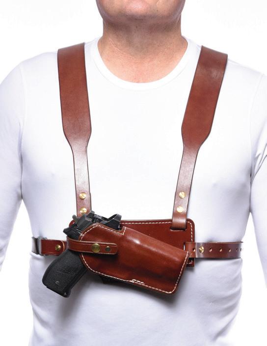 The #541 K-Max Chest holster features a dual over-theshoulders harness system that provides balance, comfort and maximum retention. Triple K’s innovative chest plate design allows for holster angle adjustment that best meets your style of carry. Adjustable holster angles allow for canted 45-degree, horizontal- or vertical-style carry. Rugged and reliable with easy-to-personalize adjustments for all torso sizes. Constructed of premium saddle-grade vegetable-tanned leather, solid brass rings and Chicago screws that are resistant to the most diverse elements. Havana brown color. MSRP: $310.
