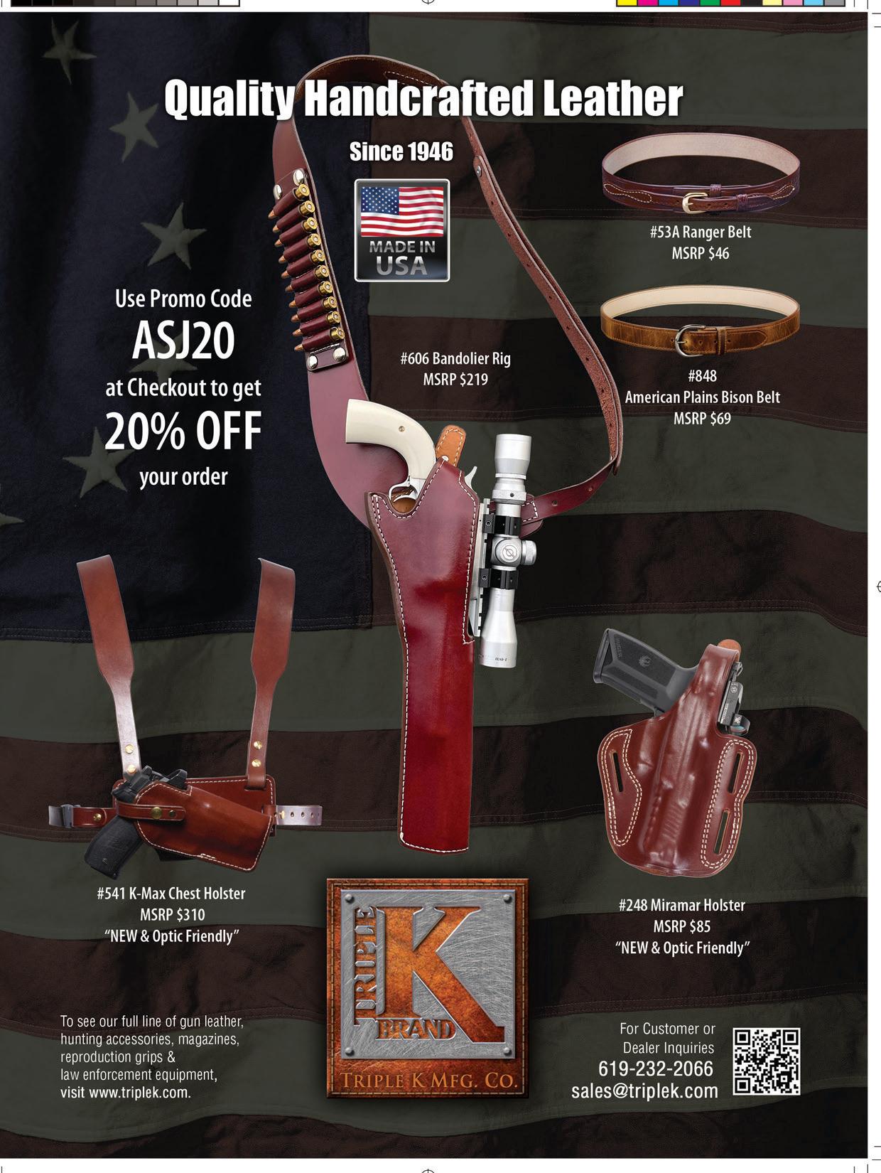 The #541 K-Max Chest holster features a dual over-theshoulders harness system that provides balance, comfort and maximum retention. Triple K’s innovative chest plate design allows for holster angle adjustment that best meets your style of carry. Adjustable holster angles allow for canted 45-degree, horizontal- or vertical-style carry. Rugged and reliable with easy-to-personalize adjustments for all torso sizes. Constructed of premium saddle-grade vegetable-tanned leather, solid brass rings and Chicago screws that are resistant to the most diverse elements. Havana brown color. MSRP: $310.