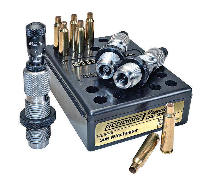 A Redding Premium Die Set (available for over 100 cartridges) featuring a free-floating carbide expander button (allowing for self-centering in the case neck) makes inside neck sizing smoother, easier, without lubrication and improves overall concentricity. The micrometer-equipped seating stem allows for precise bullet seating depth and is also available with metric scale micrometers. Offers handloaders the convenience of fast and accurate changes in bullet seating depth in their measuring scale of preference. Makes it easier than ever to fine-tune your favorite loads or take the guesswork out of loading multiple bullet types with the same seating die.