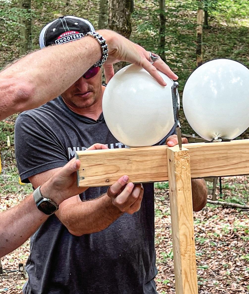 Wild Shots also features top firearms influencers, who bring their unique styles and massive social reach to the show. Here, 22Plinkster sets up for a trick shot where he attempts to split a bullet with the blade of a knife to pop two balloons. (AMERICAN STORIES ENTERTAINMENT)