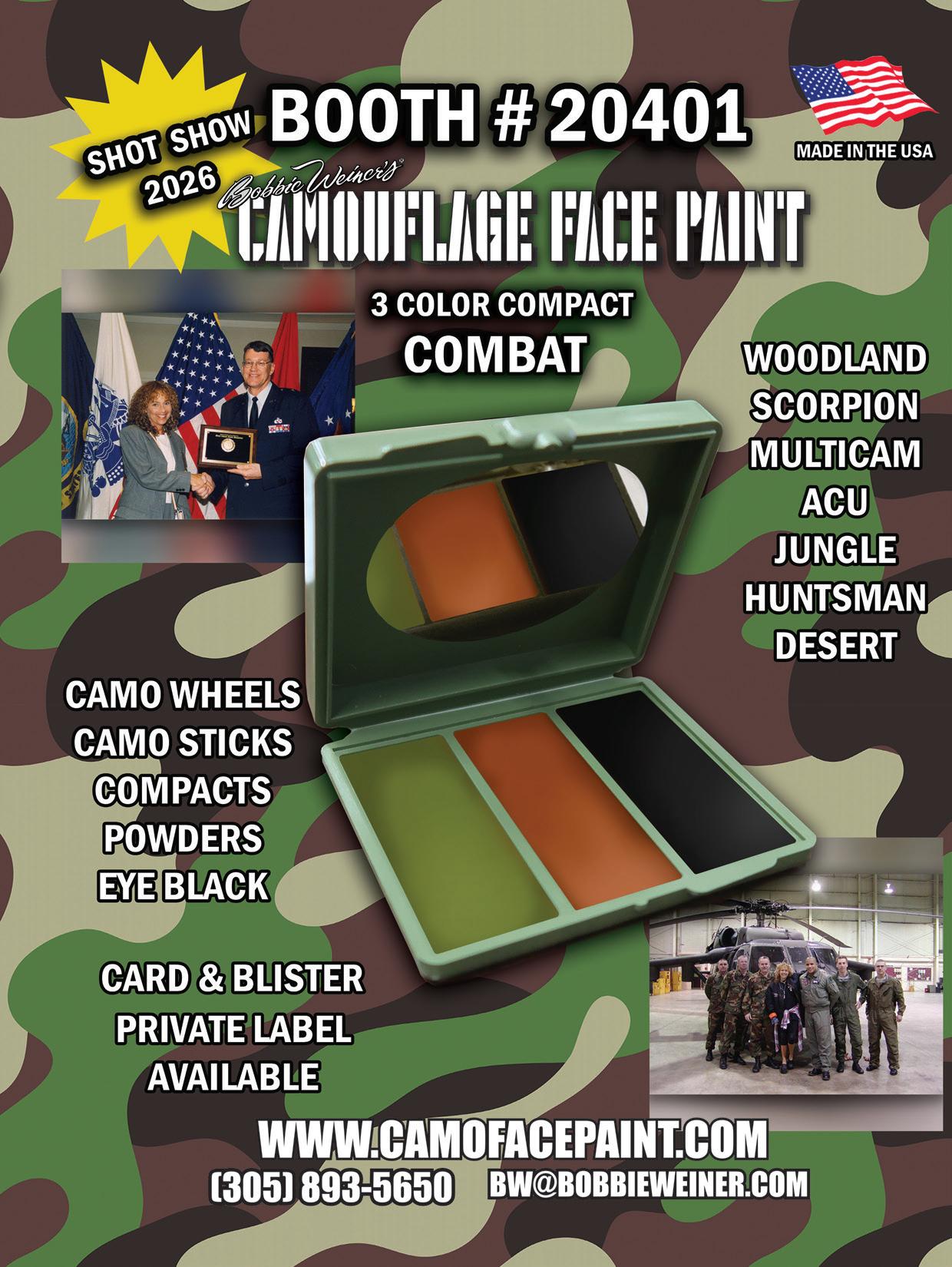 Camo Face Paint, Inc. is the number one supplier of face paint to all branches of the US military. “Combat” is the newest tri-color compact in their line of face paint. They offer three-, four- and five-color compacts, as well as tubes in various camouflage colors including eye black. All face paint is made and packaged in the USA with quality ingredients that are hypoallergenic, odorless, nontoxic, wash off with soap and water, and have a five-year shelf life. Please visit the Camo Face Paint website to see their vast selection. They ship bulk or carded and blistered for store displays. They also offer private labeling.