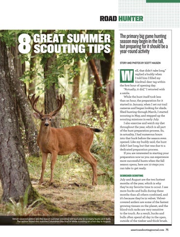 SCORCHER SCOUTING July and August are the two hottest months of the year, which is why they’re my favorite time to scout. I see more bucks and bulls during these months than all others combined, and it’s because they’re in velvet. Velvetcovered antlers are some of the fastest growing tissues on the planet, and the blood-rich racks are very sensitive to the touch. As a result, bucks and bulls often spend all day in the open, outside of the timber and thick brush. americanshootingjournal.com 75