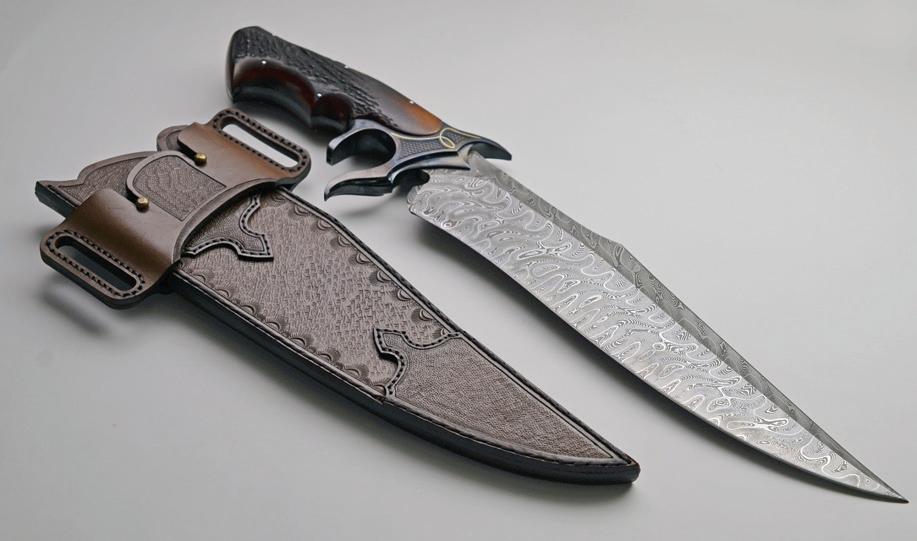 Exquisiteknives.com offers the finest of collectible custom knives. This fine Subhilt fighter is from a threebrother team from Argentina, CAS. The Damascus steel blade is breathtaking, and the fittings are blued as well as textured with tasteful gold accents. Stag handle is expertly shaped and feels great in the hand. Youngest brother Marcelo makes the sheaths and he is really putting out some awesome stuff! Exquisiteknives.com is your one-stop shop online for hunters, fighters, Bowies, high-end folding knives and many of the hardest-to-find knifemakers.
