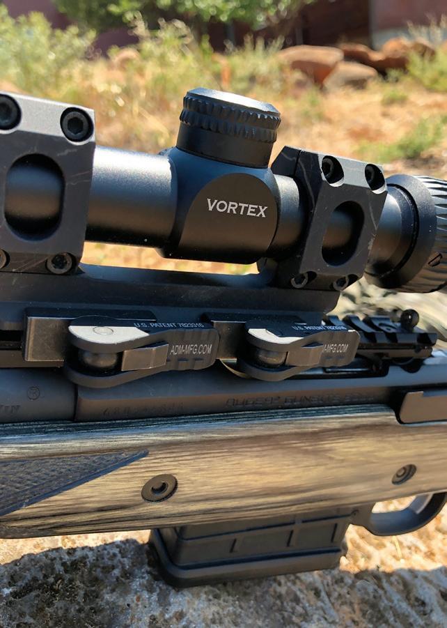 Early-generation Leupold 1.25 by 4-power low-power variable optic with an American Defense quick detach mount. This scope/ mount pair is virtually indestructible. the mounts completely. Look through the mounted optic at the plum line, ensuring that the north/southrunning crosshair lines up with the plum line. Once that’s done, tighten up the mounts. You can confirm your optic is mounted correctly by placing a level on the top turret. • Torque wrench. Most scopes and mounts will list a specified torque pound amount for tightening. It is important to adhere to this. Too loose and the optic will not be properly secured, will move around in the mounts and not maintain a consistent zero. Too tight and you can damage the scope tube. Read the instructions. • Loctite. Loctite can be useful when mounting rails to guns. Like torque rates, read the manufacturer’s recommendation about when to use it. Generally, I’ve seen it recommended to be applied to screws and bolts that hold rails and, in some cases, mounts in place.
