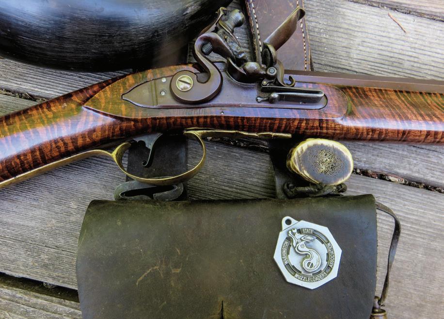 muzzleloading rifles have. Then inside that octagon, as if in the crown of the muzzle, are the words “Washington State Muzzleloading Association.” Toward the inside of that crown is the outline of rifling grooves and lands, for a six-groove barrel. The rifling details are somewhat overshadowed by a flintlock’s hammer, or “cock,” with a flint in its jaws. In the photo here, that flintlock hammer is silver because that