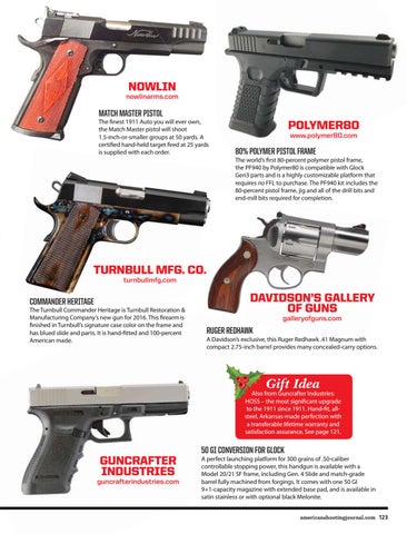 Al from Guncrafter Industries: Also HOSS – the most significant upgrade to the 1911 since 1911. Hand-fit, allsteel, Arkansas-made perfection with a transferable lifetime warranty and satisfaction assurance. See page 121.