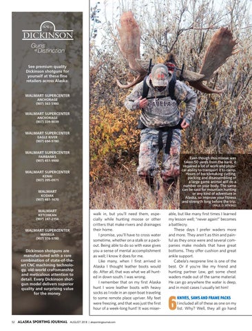 walk in, but you’ll need them, especially while hunting moose or other critters that make rivers and drainages their home. I promise, you’ll have to cross water sometime, whether on a stalk or a packout. Being able to do so with ease gives you a sense of mental accomplishment as well; I know it does for me. Like many, when I first arrived in Alaska I thought leather boots would do. After all, that was what we all hunted in down south. I was wrong. I remember that on my first Alaska hunt I wore leather boots with heavy socks as I rode in an open boat traveling to some remote place upriver. My feet were freezing, and that was just the first hour of a week-long hunt! It was miser52