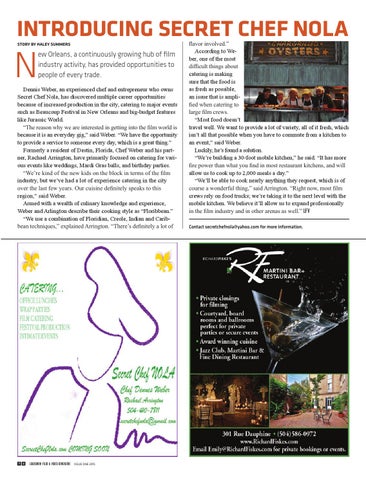 Ă€DYRU LQYROYHG ´ According to Weber, one of the most GLIÂżFXOW WKLQJV DERXW catering is making sure that the food is as fresh as possible, an issue that is ampliÂżHG ZKHQ FDWHULQJ WR ODUJH ÂżOP FUHZV “Most food doesn’t travel well. We want to provide a lot of variety, all of it fresh, which isn’t all that possible when you have to commute from a kitchen to an event,â€? said Weber. Luckily, he’s found a solution. “We’re building a 30-foot mobile kitchen,â€? he said. “It has more ÂżUH SRZHU WKDQ ZKDW \RX ÂżQG LQ PRVW UHVWDXUDQW NLWFKHQV DQG ZLOO allow us to cook up to 2,000 meals a day.â€? “We’ll be able to cook nearly anything they request, which is of FRXUVH D ZRQGHUIXO WKLQJ ´ VDLG $UULQJWRQ Âł5LJKW QRZ PRVW ÂżOP crews rely on food trucks; we’re taking it to the next level with the mobile kitchen. We believe it’ll allow us to expand professionally LQ WKH ÂżOP LQGXVWU\ DQG LQ RWKHU DUHQDV DV ZHOO ´ LFV Contact secretchefnola@yahoo.com for more information.