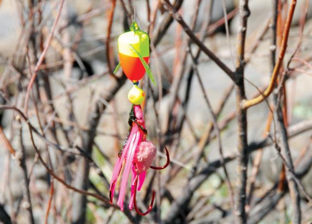 Bonneville plunkers primarily use Spin-N-Glos, hoochies and tuna balls wrapped in mesh; here is what the setups look like before (above) and after (above left) adding the bait. The green material on the winged drift bobber is moss that got snagged on the setup. (BUZZ RAMSEY)