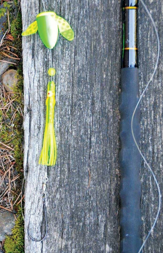 least when fishing areas with rocky bottoms and riprap shore structure. It’s all about being able to retrieve fast enough to keep your sinker from possibly hanging bottom. This proved difficult with the 4.4-to-1retrieve-speed reel I used on my first trip. Realizing that hanging up my weight was a possibility, I did employ 15-pound-test mono for the dropper line extending to my sinker, which I hoped would break before my mainline if I did hang bottom.