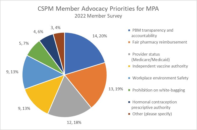 Not only were we able to provide excellent patient care, another opportunity for pharmacy occurred in Lansing. The Michigan Legislature and Gov. Gretchen Whitmer gave pharmacy a big win when the governor signed House Bills 4348, 4351 and 4352 in February 2022. These bills provide for the licensure of pharmacy benefit managers (PBMs) in Michigan, which will assist in lowering the cost of prescription drugs, prohibit PBMs from increasing costs when reimbursing pharmacies for prescription drugs and allowing for more transparency. Other pharmacy-forward legislation that was signed or introduced within the last year include capping the price of insulin, a standing order to allow community organizations to distribute opioid antagonists, prescribing hormonal contraceptives without supervision from a prescriber and allowing pharmacists to be reimbursed for services provided to medically underserved areas.4, 5 Thank you to our members, MPA staff, the Pharmacy Advocacy Response Team (PART) and lobbyists for making this possible!