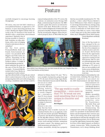 Of course, once you view kids’ content as a cross-platform business, as opposed to a TV business, it raises interesting questions. For a start, should your digital content relate directly to the TV iteration of the brand? Or should it offer a stand-alone entertainment experience? Similarly, does it become possible to launch a kids’ franchise on other platOne of the big trends to forms, with a view to bringing have emerged in the era it back to television in the secof digital entertainment is ond phase? the rise of toy companies as On the first point, content creators and ownFremantleMedia Kids and ers. In part, this has been Family Entertainment exdriven by the opportunity ecutive vice-president Bob for them to own media, as Higgins says both routes are opposed to renting it from options, depending on the third parties. But it is also property and what you are an acknowledgement that trying to achieve. A couple of toy brands face the same FremantleMedia-produced challenge as TV series: if shows underline the point. In they are not available in all the case of Tree Fu Tom, for Warren Buffett’s Secret Millionaires Club: voice talent includes Bill Gates, Jay-Z, Shaquille O’Neal, Nick forms across all platforms, example, FremantleMedia Cannon, Gisele Bundchen and Kelly Rowland they risk being detached worked with Crane Media on from fans. an augmented reality technolThe toy/content/digital relationship has takdebuted on Disney Junior US, says: “We’ve ogy that allowed kids to bring the pre-school en many forms, including The Lego Movie, seen example of properties going from app show’s central character to life on an iPad by Mattel’s acquisition of pre-school stuto TV, the most obvious being Angry Birds. juxtaposing him with real-world settings (thus dio HIT Entertainment and Spin Master I’d love that kind of success and do think digcreating a standalone spin-off that could be Entertainment’s deital can act as a kind cision to join forces of reverse engineerwith Mondo Media to ing test lab. My main launch kids-focused warning, however, “The app world is crazily cha n nel is that the app world competitive — even more so YouTube Spindo TV. is crazily competiHasbro, meanwhile, tive — even more so than TV. To break out you has a number of TV than TV. So to break need something that is truly series based on toy out you need to have unique in character and prop er t ies , not asomething that is trudesign” bly Transformers, ly unique in character Bob Higgins My Little Pony and and design.” Littlest Pet Shop. Henson is one comSu m ma r i si ng t he pany that has been company’s view of the new digital landscape, exploring this route to market. Last year, it senior vice-president of international distrilaunched Chatter Zoo as an appisode, workbution and development Finn Arnesen says: ing with new-media specialist Mindshapes. “We’re still working with all the major kids’ Created by Alex Rockwell (Pajanimals; Bear networks but we welcome the emergence of adIn The Big Blue House), Chatter Zoo is an ditional platform partners. For us, the key issue interactive pre-school property that features is to get the right balance between the camps.” stories, learn and play activities, animations In terms of how digital impacts on Hasbro’s and music content. The ultimate goal is to content, Arnesen says: “With a franchise like build momentum and adapt for TV. Transformers, we’re always thinking about Genius, meanwhile, already has a property Transformers, one of Hasbro’s series based on toy properties preview magazine I March 2015 I www.miptv.com
