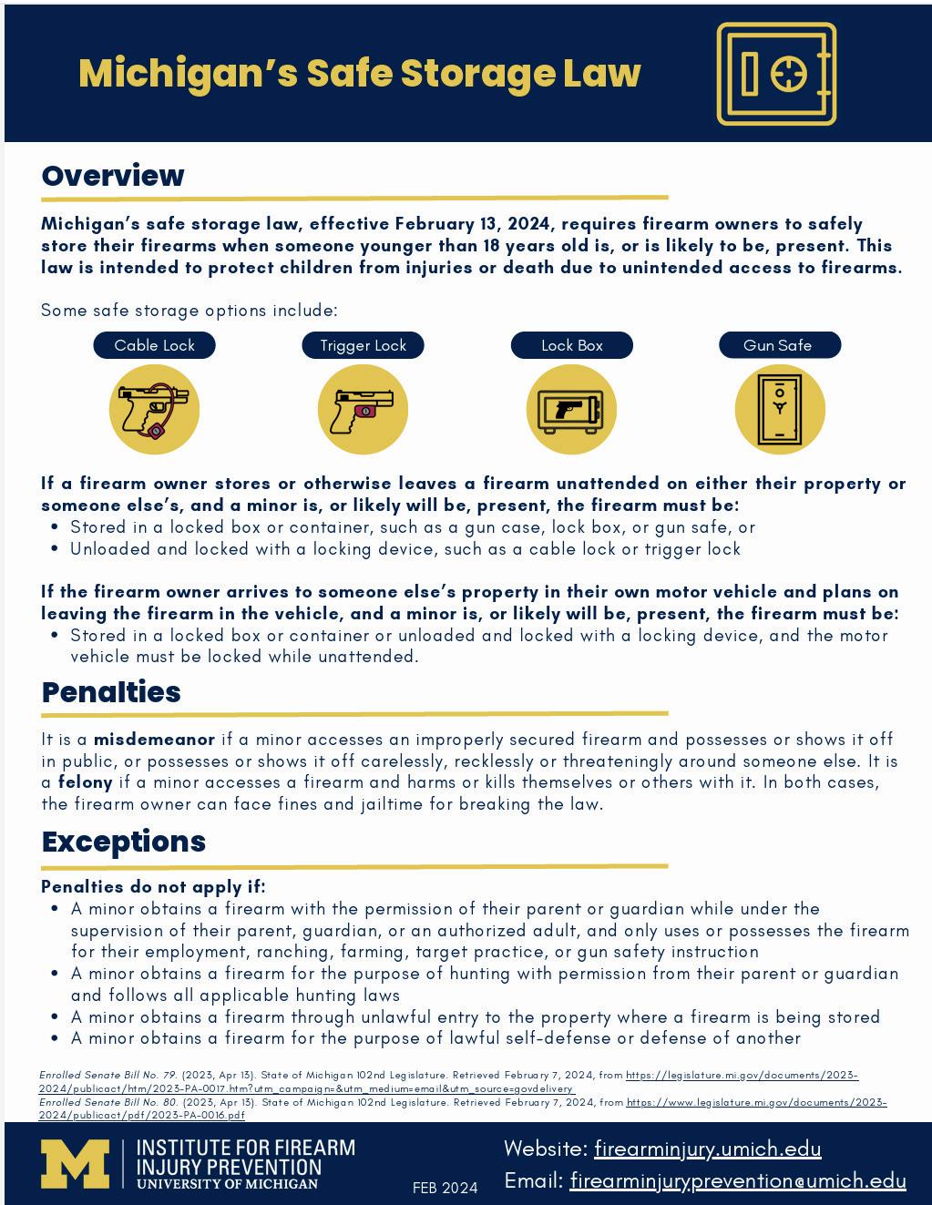Michigan's secure storage law, Public Act 17 of 2023, requires that firearms be stored securely with a gun lock or in a gun safe when kids are at the home. If a child accesses a gun, the gun's owner faces stiff penalties, especially if someone gets hurt.