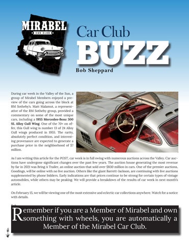 During car week in the Valley of the Sun, a group of Mirabel Members enjoyed a preview of the cars going across the block at RM Sotheby’s. Matt Malamut, a representative of the RM Sotheby group, provided a commentary on some of the most unique cars, including a 1955 Mercedes-Benz 300 SL Alloy Gull Wing. One of the 70+ on offer, this Gull wing is number 13 of 24 Alloy Gull wings produced in 1955. The rarity, absolutely perfect condition, and interesting provenance are expected to generate a purchase price in the neighborhood of $7 million. As I am writing this article for the POST, car week is in full swing with numerous auctions across the Valley. Car auctions have undergone significant changes over the past few years. The auction house generating the most revenue by far in 2021 was Bring A Trailer, an online auction that sold over $830 million in cars. One of the premier auctions, Goodings, will be online with no live auction. Others like the giant Barrett-Jackson, are continuing with live auctions supplemented by phone bidders. Early indications are that prices continue to be strong for certain types of vintage automobiles, while others may be peaking. We will provide a breakdown of the results of car week in next month’s article. On February 15, we will be viewing one of the most extensive and eclectic car collections anywhere. Watch for a notice with details.