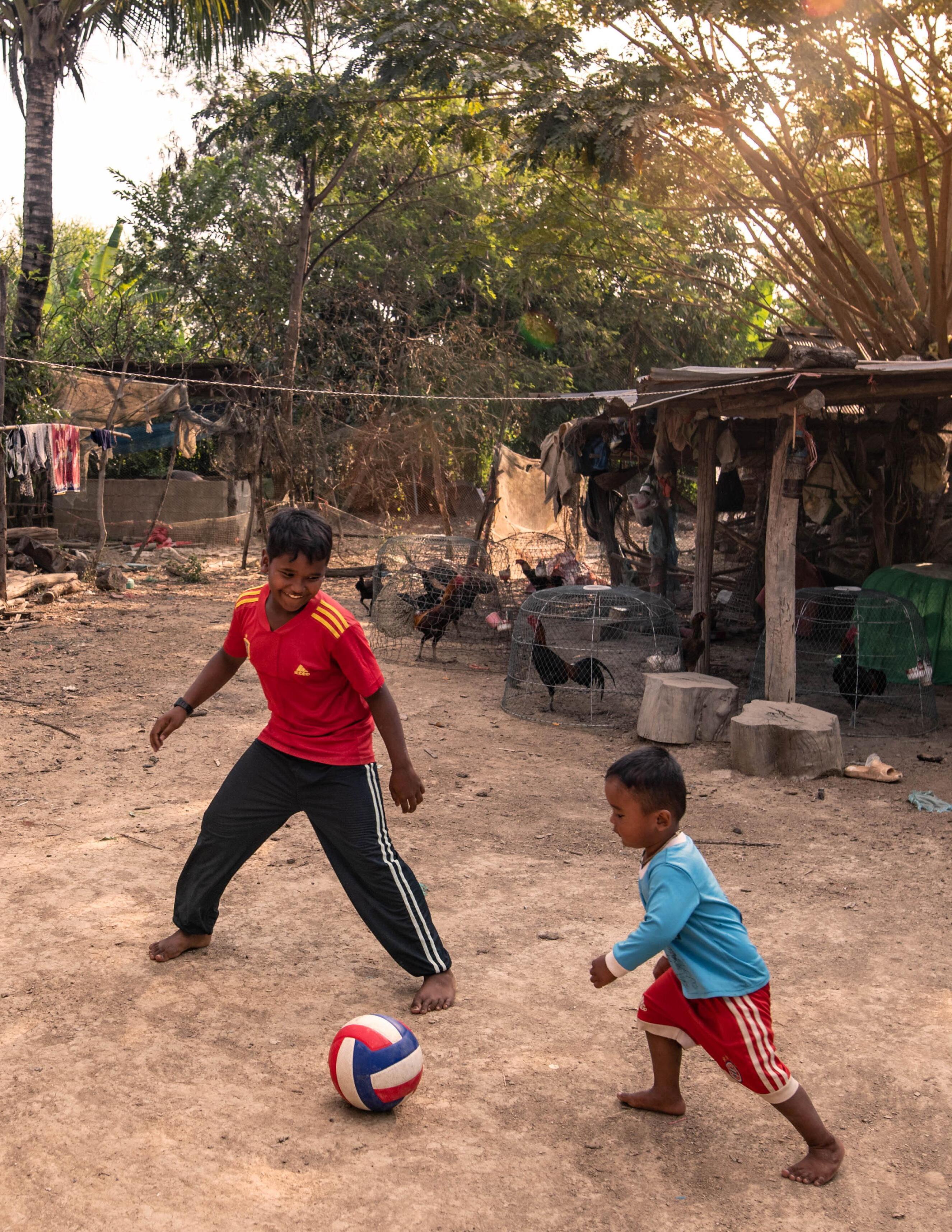 Simeon, age 5, walks with his father to their family’s fishing spot near their home. Since receiving clubfoot treatment at a MiracleFeet-supported clinic, he can now join in everyday childhood experiences like playing soccer with his friends and fishing with his dad.