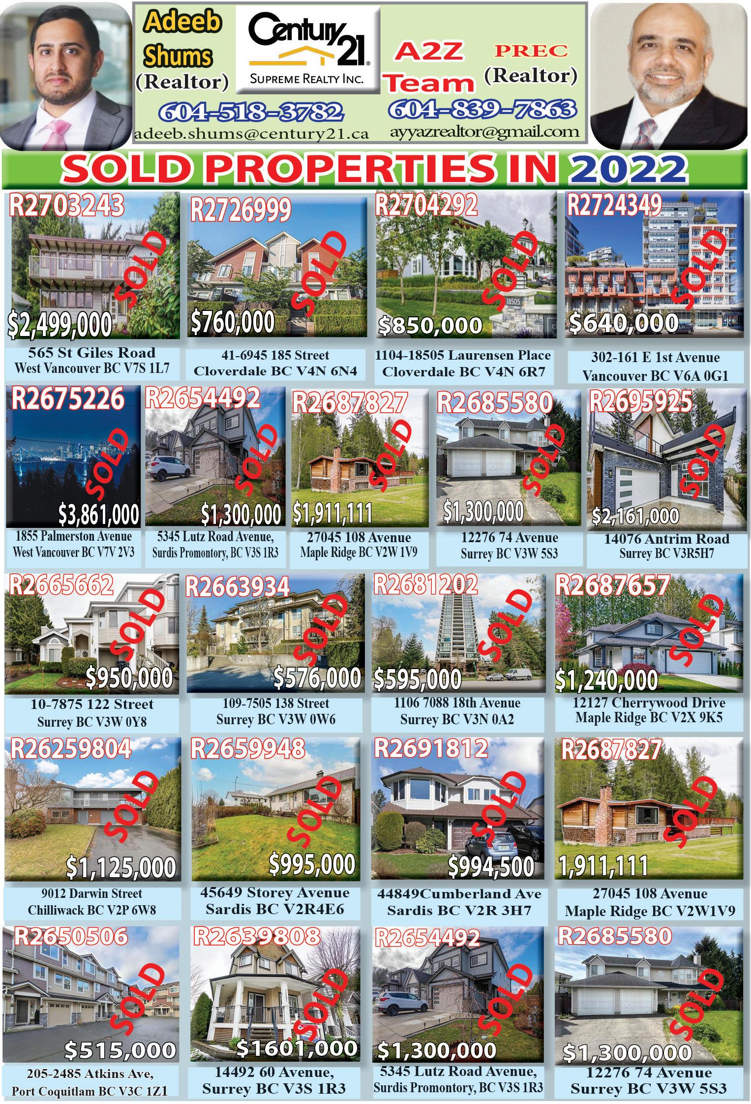 12 Rabiul Thani 24,1444 November 18 ,2022 Sold Properties In 2022 604 -518 - 3782 adeeb.shums@century21.ca (Realtor) (Realtor) 604 - 839 - 7863 ayyazrealtor@gmail.com PREC A2Z Team Adeeb Shums Ayyaz Shums $1265,000 $760,000 $999,000 $1,860,000 $530,000 $638,000 $1,425,000 $1,375,000 $1,200,000 $950,000 $725,000 $1601,000 $1,300,000 $975,000 $999,000 $630,000 3368 Princeton Avenue Coquitlam BC V53E 0G2 102-6438 195A Street Cloverdale BC V3S 0W3 106-9009 Cornerstone Mews Burnaby BC V5A 0B9 Maple Ridge BC V2W 1Z9 205-2485 Atkins Ave, Port Coquitlam BC V3C 1Z1 14492 60 Avenue, Surrey BC V3S 1R3 5345 Lutz Road Avenue, Surdis Promontory, BC V3S 1R3 42-20155 84 Avenue Langley BC V2Y 2B8 B322 8218 207A Street Langley BC V2Y 0Y1 12313 Fulton Street Maple Ridge BC V2X 6L4 #39 7947 209th Street Langley BC V2Y 2C8 24760 Kimola Drive Maple Ridge BC V2W 0A6 313-3085 Primrose Lane Coquitlam BC V3B 7S3 2706 689 Abbott Street Vancouver West V6B 0J2 164-1386 Lincoln Drive PortCoquitlamBC V3B 7G6 32-10090 137A Street Surrey BC V3T 5M6 Surrey BC V3X 1C5 R2697852 R2639808 R2700560 PRE SOLD R2630916 R2709026 R2707840 R2713027 R2705968 R2701806 Private Sale R2695209 R2701806 R2728351 R2701806 R2726373 R2654492 $515,000 R2650506 $1,125,000 $995,000 9012 Darwin Street Chilliwack BC V2P6W8 45649 Storey Avenue Sardis BC V2R4E6 R2659948 R2659806 $950,000 $576,000 10-7875 122 Street Surrey BC V3W0Y8 109-7505 138 Street Surrey BC V3W0W6 R2665662 R2663934 $1601,000 14492 60 Avenue, Surrey BC V3S 1R3 802-689 Abbott Street Vancouver West, BC V6B 0J2 15 19478 65 Avenue Cloverdale BC V4N5X5 $575,000 $705,000 $1700,000 $1950,000 $610,000 $561,000 3-9989 240A Street Maple Ridge BC V2W 1Z9 1105-9188 University Crescent Burnaby BC V5A 0A5 204-22318 Lougheed Highway Maple Ridge BC V2X2T4 R2641561 R2637347 R2643510 R2622264 R2617618 SOLD SOLD SOLD SOLD SOLD SOLD SOLD SOLD SOLD SOLD SOLD SOLD R2635245SOLD SOLD SOLD SOLD SOLD SOLD SOLD SOLD SOLD SOLD SOLD SOLD SOLD SOLD $501,000 217 Irwin Street Nanaimo BC V9R4X4 13356 236 Street Maple Ridge BC V4R 0E4 27880 Whistler Drive Abbotsford BC V4X2S1 896465 R2639808 $905,000 SOLD SOLD SOLD