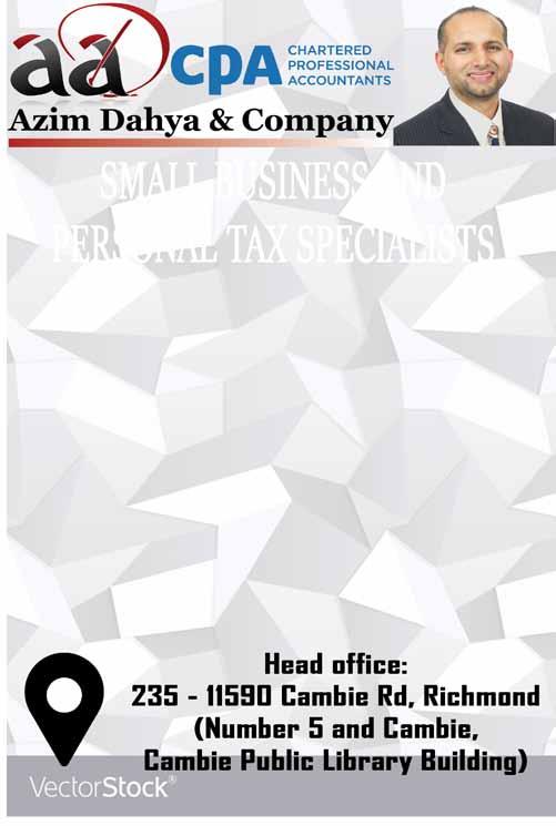 NOTARIZATIONS Certified true copies Affidavits Statutory Declarations Travel Consent Letters Insurance loss declarations Passport Applications Proof of Identity Notarization of Signatures Independent Legal Advice All other Forms and Documents AMEERA SHUMS NOTARY CORPORATION REAL ESTATE Purchasing a Home Selling a Home Refinancing/Mortgages Property Title Transfers Manufactured Homes Drafting Contracts Builder’s Liens Lease Agreements Covenants PERSONAL PLANNING Wills Power of Attorney Indian Power of Attorney Pakistan Power of Attorney Representation Agreements Advance Directives Free Consultations Flexible Office Hours Mobile Notary info@gvnotary.com 115- 13740 72A Avenue Surrey BC V3W 1N5 *Ad sponsored by Ayyaz Shums PREC and A2Z Team 604-449-7766