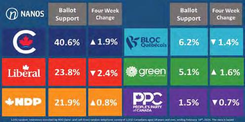 is at a level that is higher than any Conservative leader, including Stephen Harper, in the past decade,” Nanos said. “He’s basically in the driver’s seat in terms of the ballot numbers and also in the driver’s seat when it comes to who Canadians today at least would prefer as prime minister.” For the ballot support and preferred PM surveys, the data is based on a random fourweek telephone poll of 1,032 Canadians (aged 18 years and older), which is accurate 3.1 percentage points, plus or minus, 19 times out