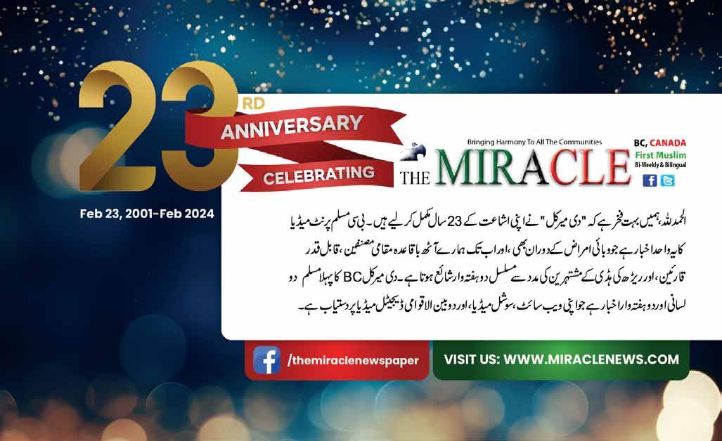 The Miracle holds a special place in the hearts of our local Muslim households, and its influence extends beyond, resonating with other communities as well. As the MLA for SurreyNewton, diversity and multiculturalism remain a focus for our government, and we appreciate the role the Miracle plays within the community Through thick and thin, even during the challenging times of the pandemic, The Miracle has stood tall, continuously publishing biweekly. This unwavering commitment is a testament to the newspaper’s dedication to “Bringing Harmony to all the Communities.”