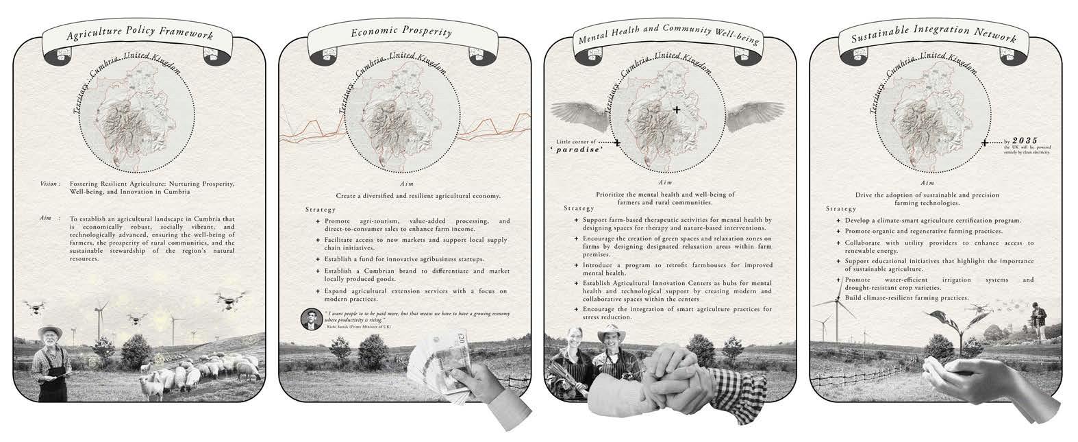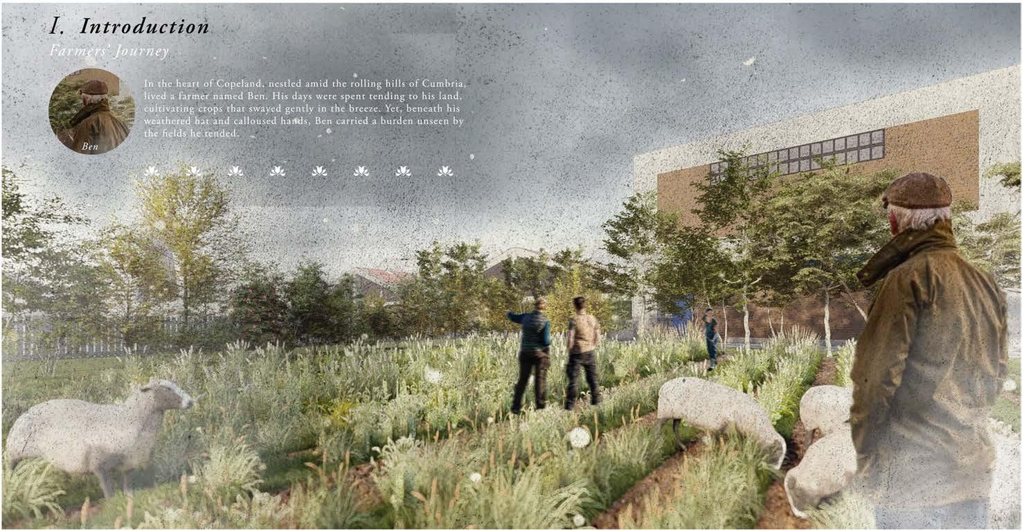 Welcome to the vision of Agriculture Utopia—a masterplan inspired by the concept of paradise. This visionary design integrates sustainable practices, innovative technologies, and community engagement to cultivate an idyllic environment for farmers. Embracing principles of harmony and abundance, this utopia envisions a flourishing landscape that nurtures both land and livelihoods. This master thesis project investigates how cultivating a stable and idyllic agricultural environment, reminiscent of ‘utopian agriculture, can positively impact Cumbria’s economy and enhance the mental well-being of its farmers. The concept of ‘utopian agriculture’ embodies an idealized vision of farming that prioritizes sustainability, social equity, and harmony with nature. The aim of this project is to revitalize the agricultural rural- community in Cumbria by creating a model community; chosen site in Cleator Mill, target community in Cleator Moor in Copeland, Cumbria showcasing utopian design principles and embodying characteristics of paradise, thereby contributing to the regional economy, promoting good mental well-being, and fostering a positive working culture for farmers.