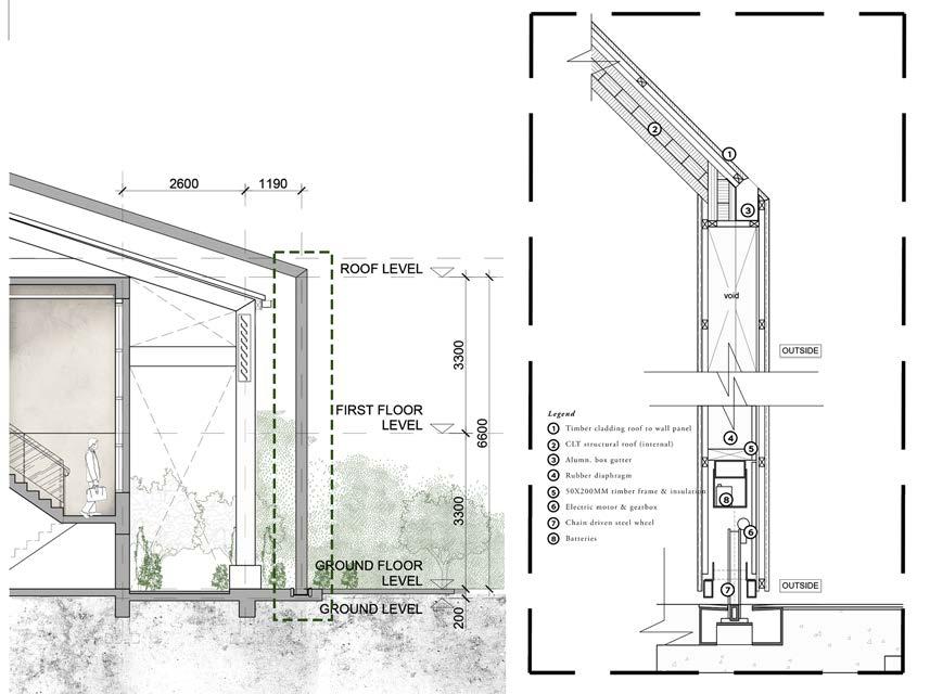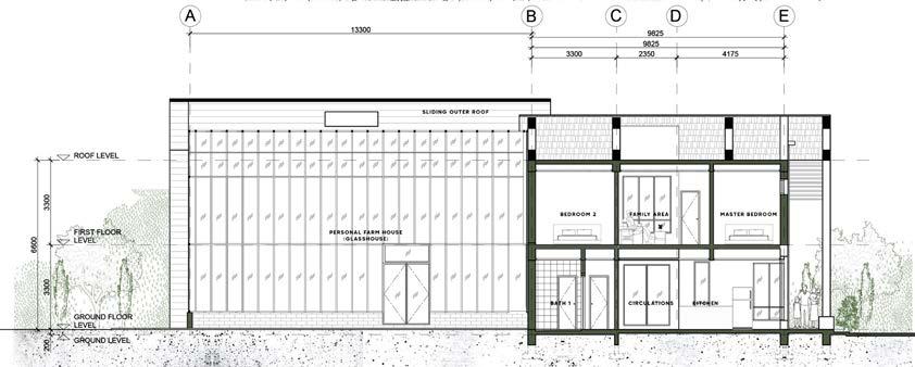 The sectional drawings of the Agri-Housing project at St. Cuthbert’s Garden Village in Carlisle illustrate the innovative integration of residential living with agricultural elements, inspired by the design principles of the Sliding House. These detailed sections reveal the thoughtful construction techniques and material choices that ensure sustainability and functionality.