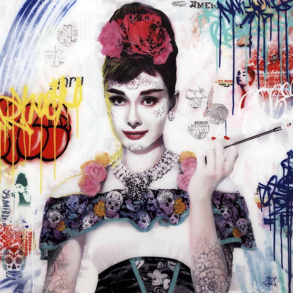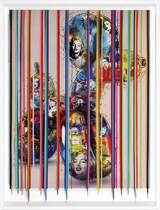 Srinjoy takes inspiration from the visual experience of the city he lives in, especially from the vibrant street art and hip-hop culture of Atlanta. The images of celebrities in alternate realities are created with spray paint, acrylic and gold leaf. Srinjoy describes his practice as “working like a hunter-gatherer” by using collage and visual sampling techniques found in graffiti. The work challenges the concept of a celebrity by celebrating identity by heightening the idealism to a level of religious iconography.