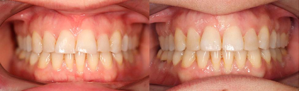 La posició inicial de les dents tancant dent contra dent, produïa un desgast de les dents accelerat. A més, feia que hi hagués diferent llum per a cada dent, de manera que es veien de diferent color, tot i no ser així. Durant del tractament amb alineadors es va alinear i donar una bona forma al somriure i es va recuperar la forma inicial de les incisives, reposant l’anatomia que s’havia perdut.